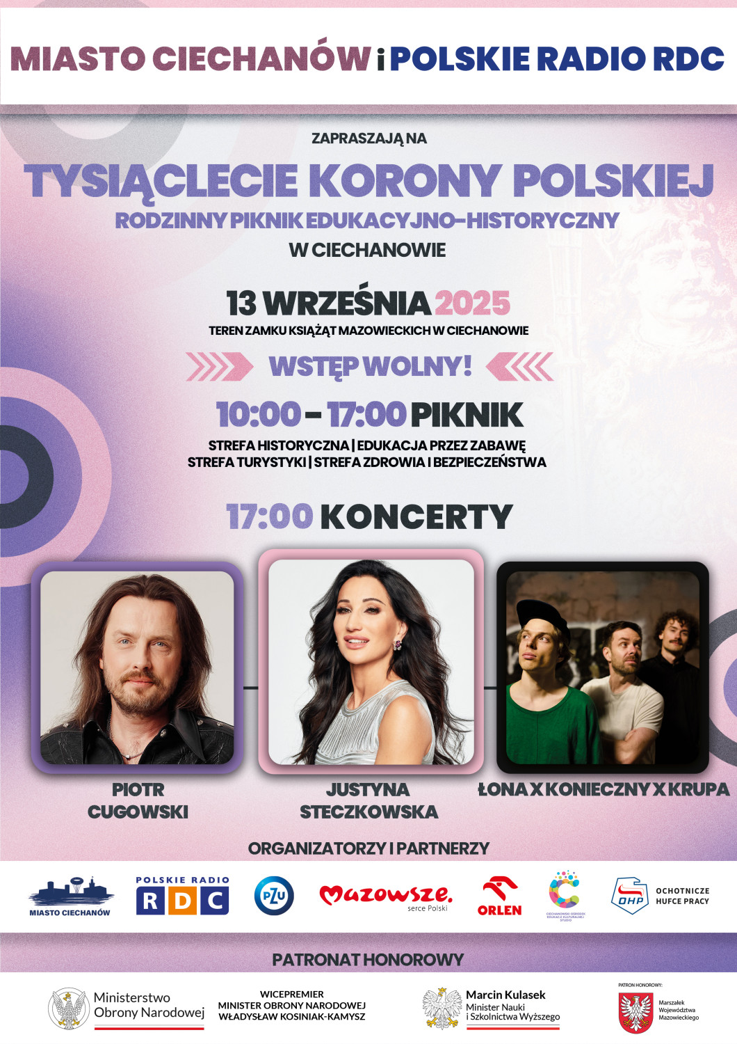 Polskie Radio RDC i Miasto Ciechanów zapraszają na wyjątkowe wydarzenie plenerowe – „Tysiąclecie Korony Polskiej” Rodzinny Piknik Edukacyjno-Historyczny, który odbędzie się 13 września (sobota) na dziedzińcu i błoniach Zamku Książąt Mazowieckich w Ciechanowie. To całodniowe święto edukacji, kultury i wspólnoty zwieńczą koncerty znakomitych artystów polskiej sceny muzycznej. Wstęp na wszystkie atrakcje oraz koncerty jest bezpłatny.