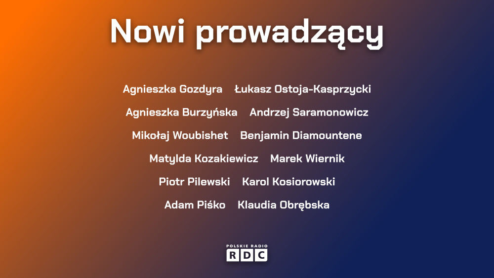 W 2024 roku na antenie Polskiego Radia RDC pojawiły się nowe głosy. Polityczne debaty prowadzą dla Państwa Agnieszka Gozdyra i Agnieszka Burzyńska. O psychologii posłuchać można w audycji Matyldy Kozakiewicz, a o wydarzeniach kulturalnych na Mazowszu - Klaudii Obrębskiej. Historię Warszawy przybliża Państwu Łukasz Ostoja-Kasprzycki. Mamy też nową audycję o zwierzętach - co niedzielę na „Na psa urok” zaprasza behawiorysta Karol Kosiorowski. O Państwa wiedzę na temat muzyki dba natomiast Marek Wiernik, a o wiedzę technologiczną - Piotr Pilewski. Benjamin Diamountene i Mikołaj Woubishet zapraszają zaś na rozmowy ze wszystkimi tymi, którzy są „pomiędzy”. Nie brakuje również ciekawych gości w audycji Andrzeja Saramonowicza. Popołudnia spędzacie Państwo natomiast z Adamem Piśko.