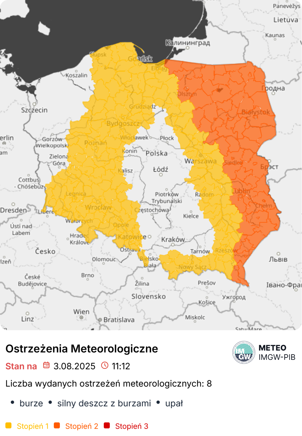 Obowiązują wydane przez Instytut Meteorologii i Gospodarki Wodnej ostrzeżenia I i II stopnia przed burzami, intensywnymi opadami deszczu i innymi, niesprzyjającymi warunkami atmosferycznymi, a także upałem.