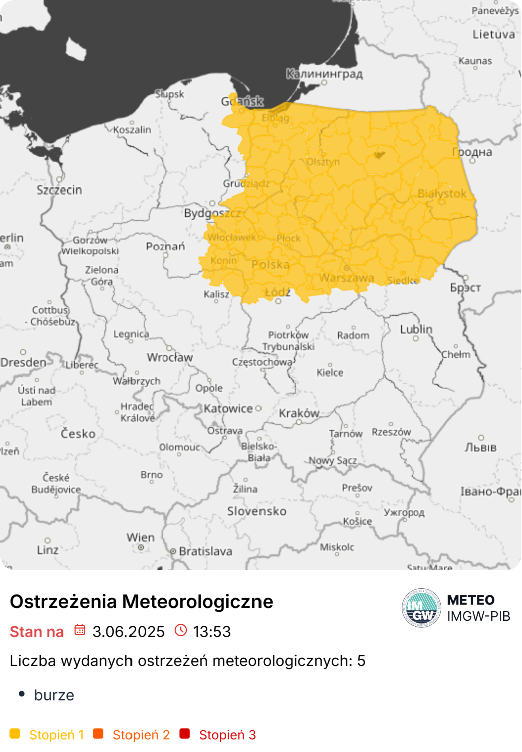 Ostrzeżenie I stopnia przewiduje warunki sprzyjające wystąpieniu niebezpiecznych zjawisk meteorologicznych mogących powodować straty materialne oraz zagrożenie zdrowia i życia. Instytut zaleca ostrożność i śledzenie komunikatów o rozwoju sytuacji pogodowej.