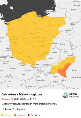Ostrzeżenie I stopnia wydano dla woj. zachodniopomorskiego, pomorskiego, warmińsko-mazurskiego, lubuskiego, wielkopolskiego, kujawsko-pomorskiego, dolnośląskiego, opolskiego, łódzkiego i części woj. mazowieckiego, śląskiego, małopolskiego i podkarpackiego. Na tym obszarze w czasie burz pojawią się silne opady deszczu do 20 mm i porywy wiatru do 85 km/h, a lokalnie grad.