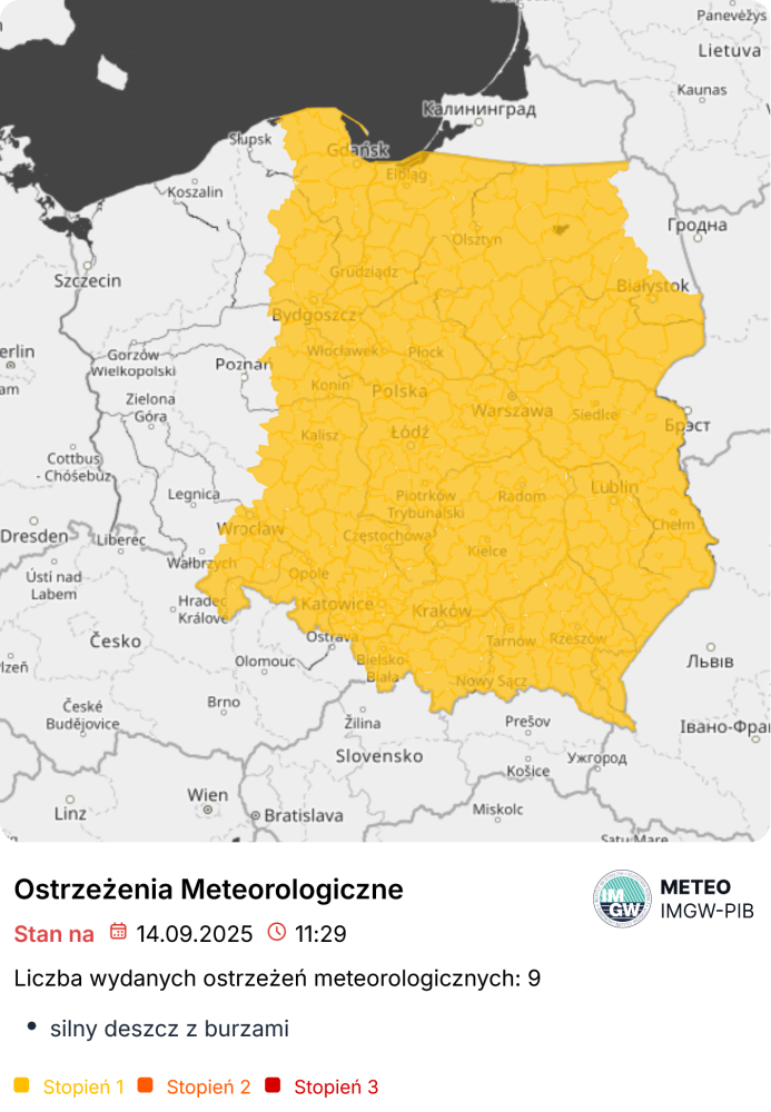 Ostrzeżenia I stopnia przed silnym deszczem z burzami wydał IMGW dla woj. warmińsko-mazurskiego, kujawsko-pomorskiego, mazowieckiego, lubelskiego, łódzkiego, świętokrzyskiego, opolskiego, śląskiego, małopolskiego i podkarpackiego oraz dla części powiatów w woj. wielkopolskim, dolnośląskim, pomorskim i podlaskim.