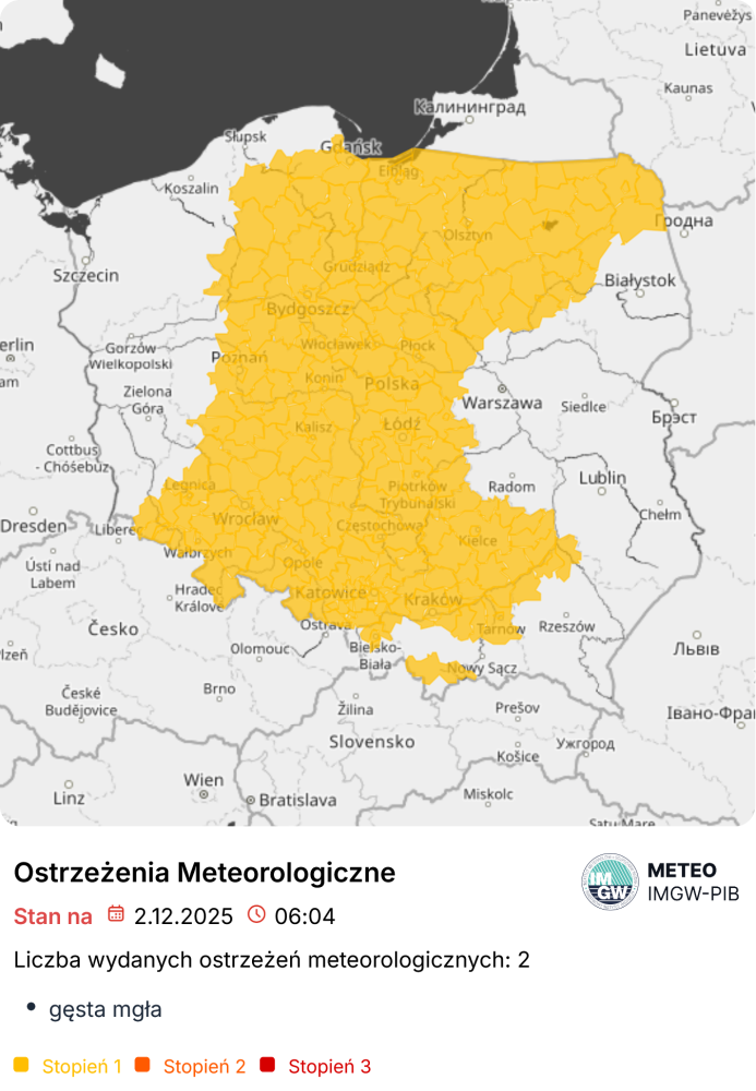 Synoptycy ostrzegają przed gęstą mgłą. Miejscami może ona ograniczać widzialność do stu metrów. Lokalnie mgła osadza szadź, powodując śliskość nawierzchni dróg i chodników. Niemal cała Polska jest objęta ostrzeżeniami pierwszego stopnia przed tym zjawiskiem, wydanymi przez Instytut Meteorologii i Gospodarki Wodnej. Będą obowiązywać one do 10:00.