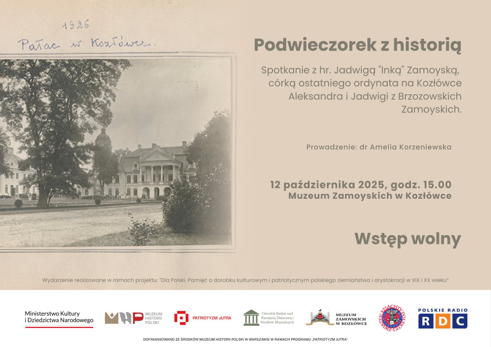 Spotkanie pod hasłem „Podwieczorek z historią” odbędzie się w niedzielę 12 października o godz. 15 w Muzeum Zamoyskich w Kozłówce. Jest to jedno z ostatnich spotkań w kraju p. Jadwigi Zamoyskiej, bowiem niedługo wyjeżdża i do Polski wróci dopiero na wiosnę. Zapraszamy!