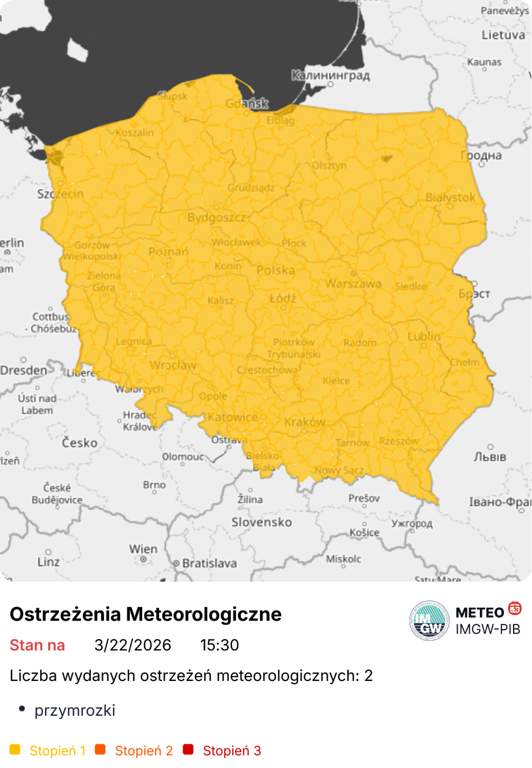 Dla całego kraju, z wyjątkiem powiatu tatrzańskiego w woj. małopolskim, IMGW wydał ostrzeżenie I stopnia przed przymrozkami. Prognozowany jest spadek temperatury powietrza do około minus 1 st. C, przy gruncie do minus 3 st. C. Ostrzeżenie obowiązuję od godz. 20:00 w niedzielę do godz. 7:30 w poniedziałek (22/23 marca). Jak dodają synoptycy, załamania oraz wyraźnej zmiany pogody spodziewamy się dopiero w środę i w drugiej połowie tygodnia. Nie wykluczają, że szczególnie na południu kraju może pojawić się więcej śniegu.