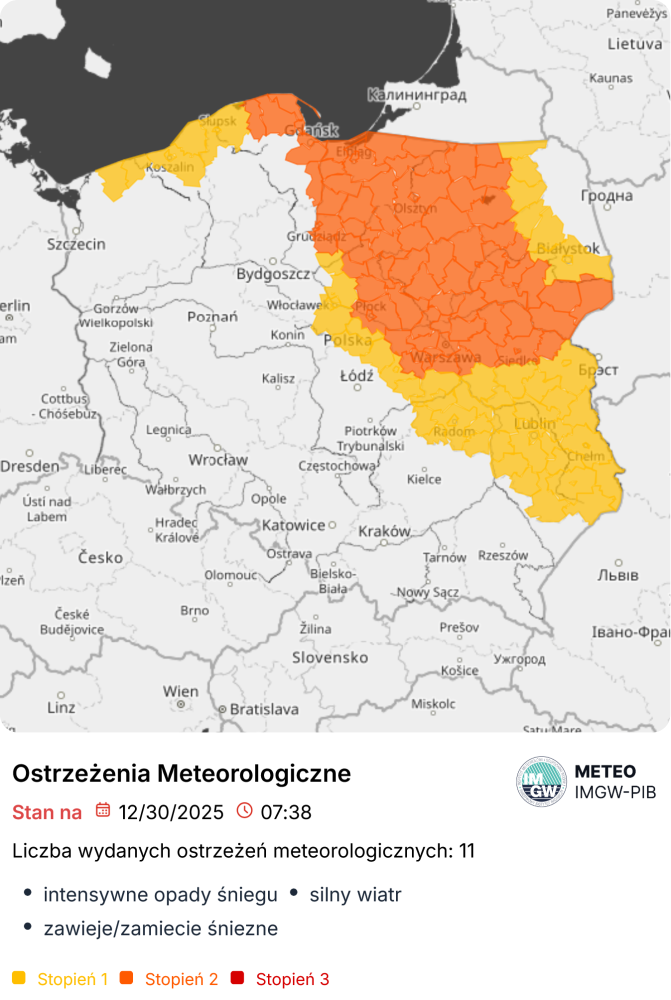 – Na północy województwa mazowieckiego obowiązuje ostrzeżenie na intensywne opady śniegu, lokalnie z przyrostem pokrywy do Sylwestra do 30 cm, ale niewykluczone, że lokalnie nawet do 50 cm. Do tego mamy wydane ostrzeżenie na silny, porwisty wiatr do 85 km/h – mówi Agnieszka Prasek z IMGW.