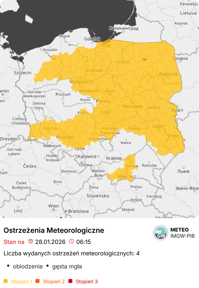 Instytut Meteorologii i Gospodarki Wodnej wydał ostrzeżenia I stopnia przed gęstą mgłą dla dziewięciu województw oraz przed oblodzeniem dróg i chodników po opadach mokrego śniegu dla ośmiu województw. Alerty zaczęły obowiązywać o godz. 19 we wtorek i obejmują przeważający obszar kraju.