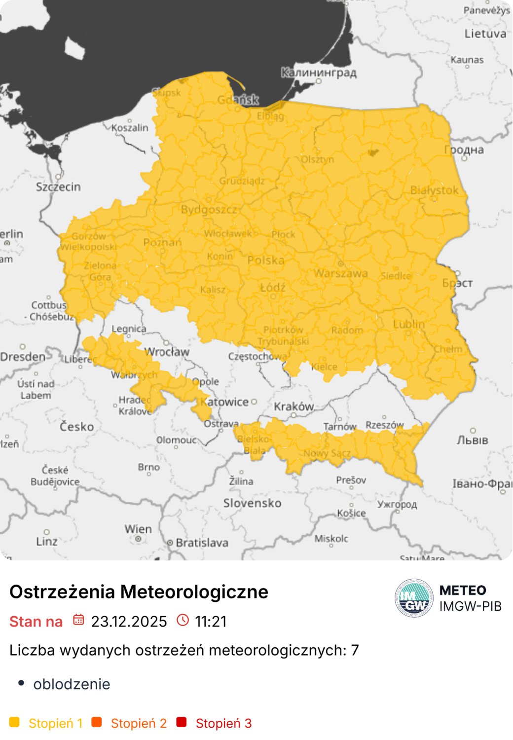 Najnowsze ostrzeżenia przed oblodzeniem I stopnia zostały wydane dla województw: warmińsko-mazurskiego, podlaskiego, lubelskiego, mazowieckiego, łódzkiego, kujawsko-pomorskiego, pomorskiego, wielkopolskiego, a także znacznej części woj. świętokrzyskiego.