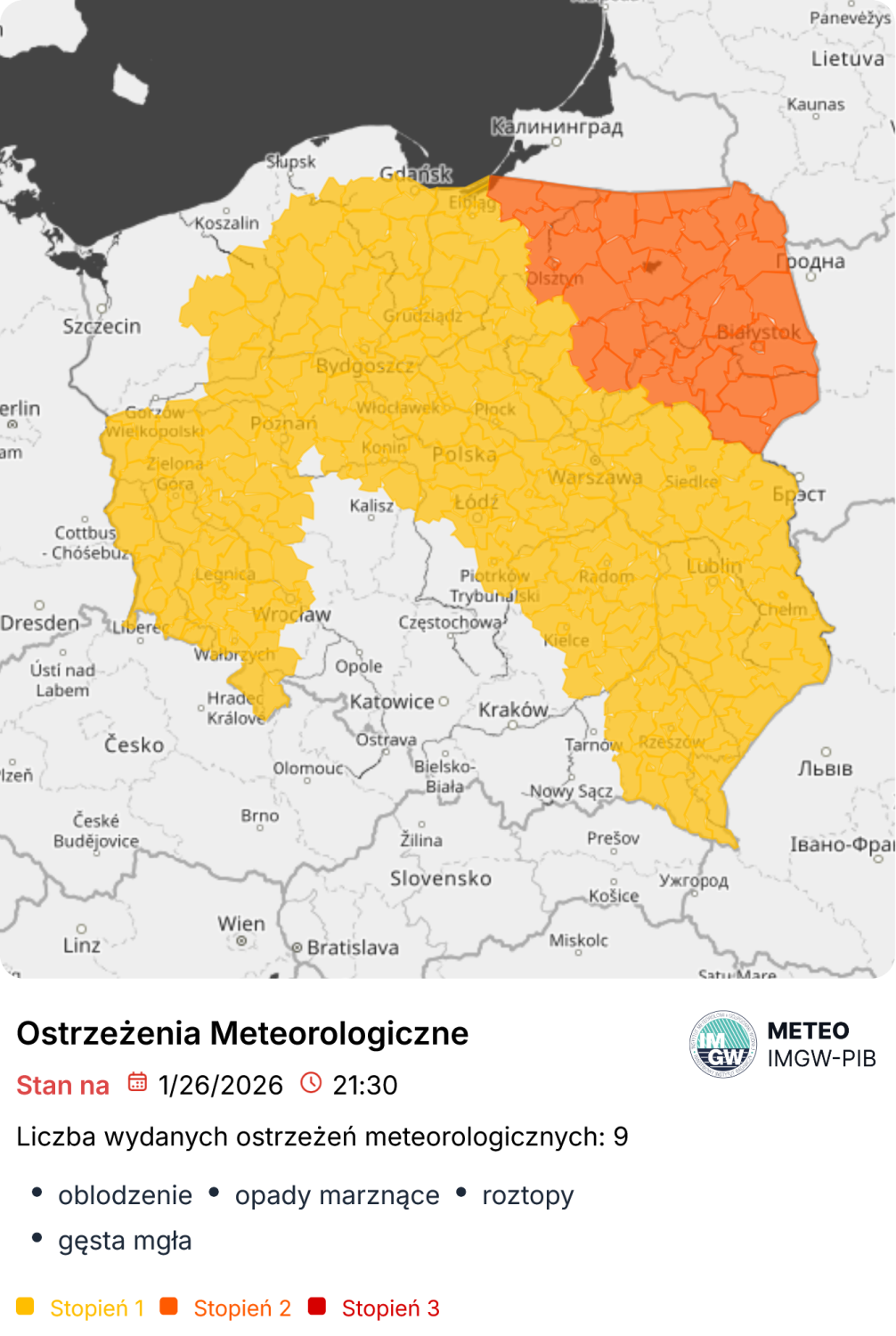 Ostrzeżeniami II stopnia przed opadami marznącymi objęte są województwo podlaskie, wschód woj. warmińsko-mazurskiego i powiaty na północy woj. mazowieckiego. Alerty I stopnia ogłoszono dla woj. lubelskiego oraz wschodniej części woj. mazowieckiego. W tych regionach IMGW prognozuje słabe, a przejściowo umiarkowane opady marznącego deszczu i mżawki powodujące gołoledź. Ostrzeżenia będą obowiązywały do godz. 12:00 we wtorek (27 stycznia).