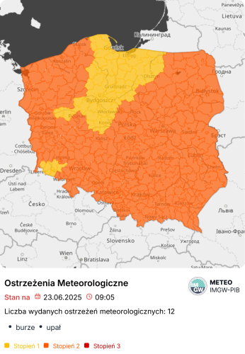 Alerty burzowe drugiego stopnia dla naszego regionu wydał też Instytut Meteorologii i Gospodarki Wodnej. „Prognozowane są burze, którym miejscami będą towarzyszyć bardzo silne opady deszczu od 25 mm do 40 mm, oraz porywy wiatru do 80 km/h, a lokalnie do 90 km/h. Lokalnie grad” - czytamy w komunikacie.