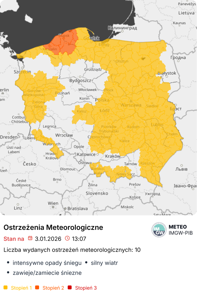 Instytut Meteorologii i Gospodarki Wodnej wydał ostrzeżenia przed zawiejami i zamieciami śnieżnymi dla przeważającej części kraju. W części regionów prognozowane są intensywne opady śniegu z przyrostem pokrywy do 30 cm; na wybrzeżu silny wiatr.