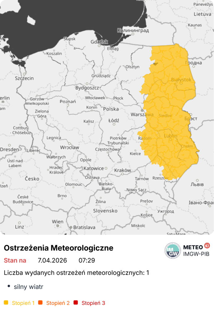 Alerty przed silnym wiatrem zaczną obowiązywać we wtorek po południu i obejmą województwo lubelskie oraz podlaskie, a także w części woj.: mazowieckiego, warmińsko-mazurskiego, świętokrzyskiego i podkarpackiego. Na tych obszarach średnia prędkość wiatru może wynieść od 55 do 70 km/h, a w porywach do 85 km/h.