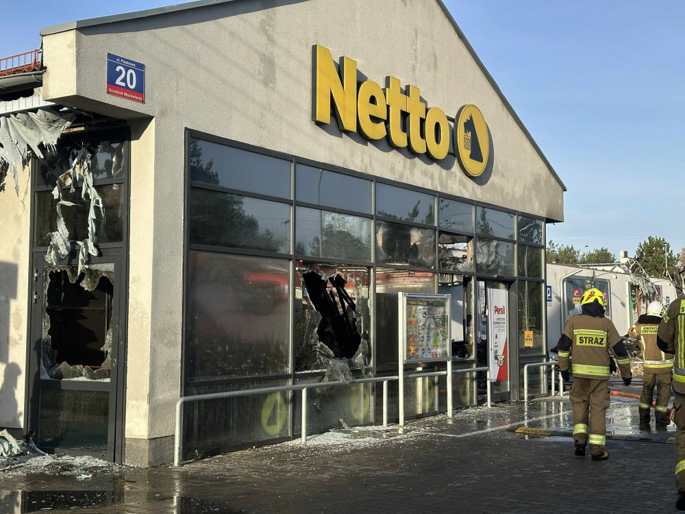 Doszczętnie spalony sklep Netto wiele godzin dogaszali strażacy. Policja zabezpiecza teren i przygotowuje się do oględzin pogorzeliska.