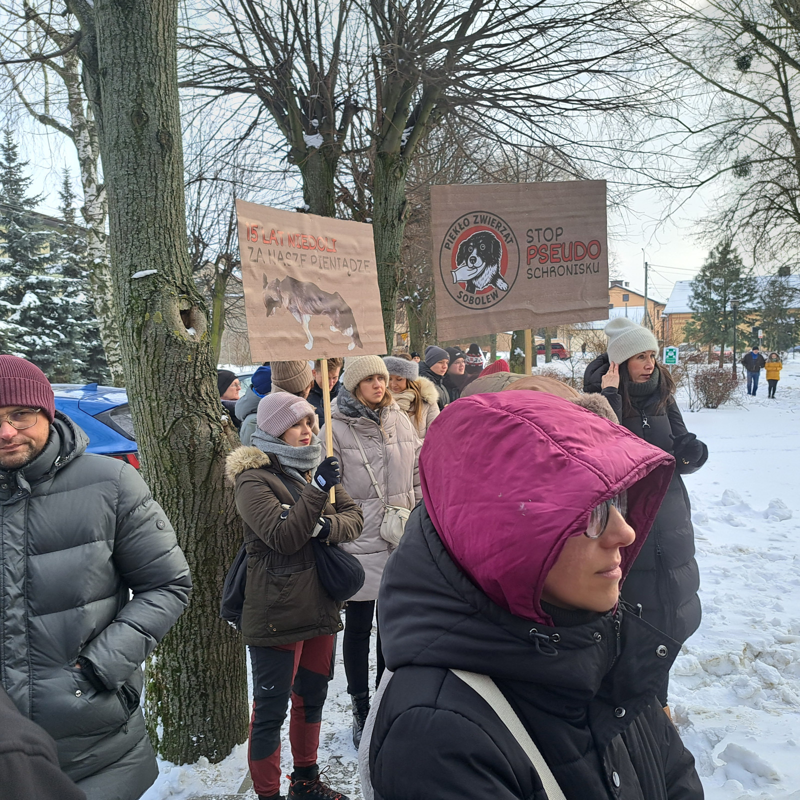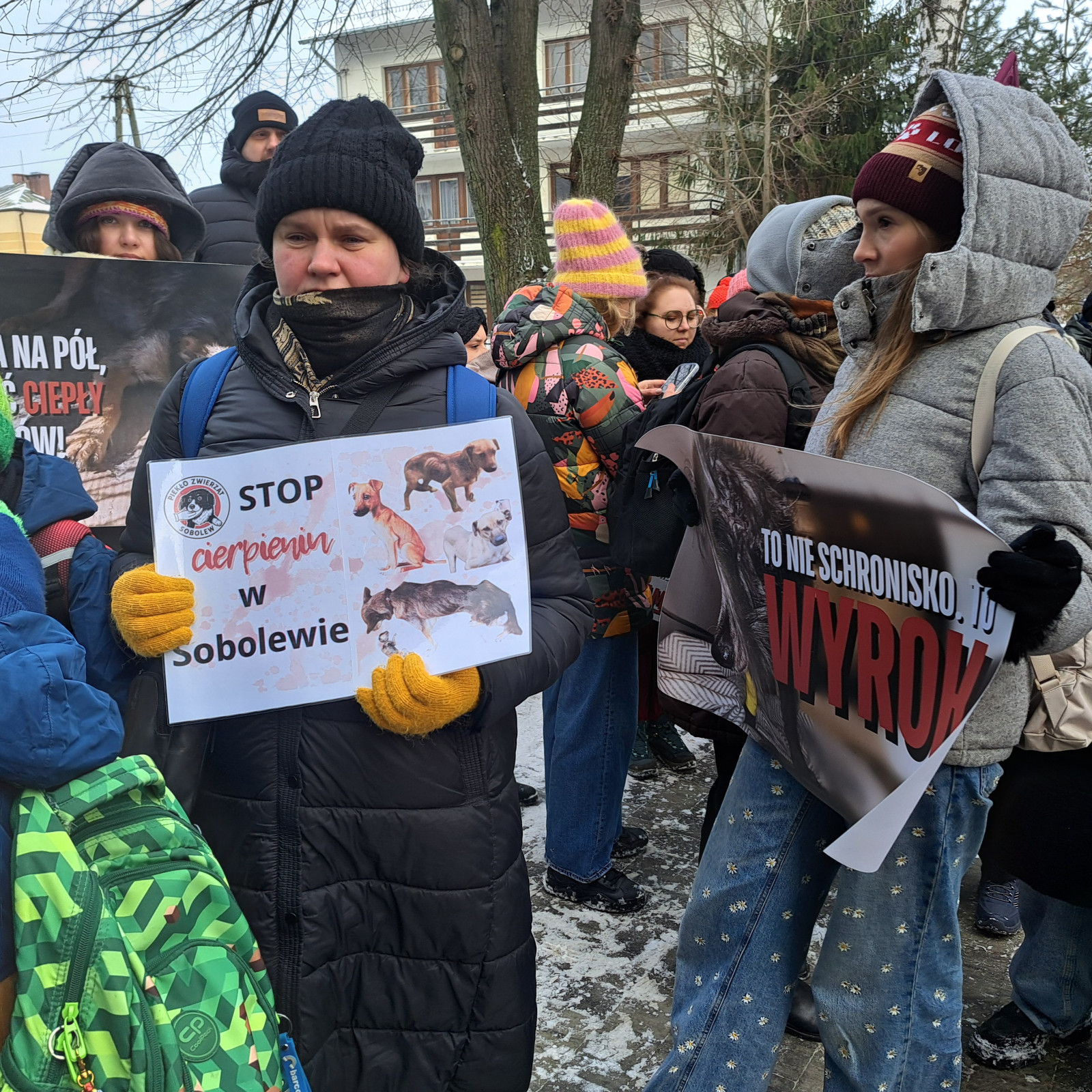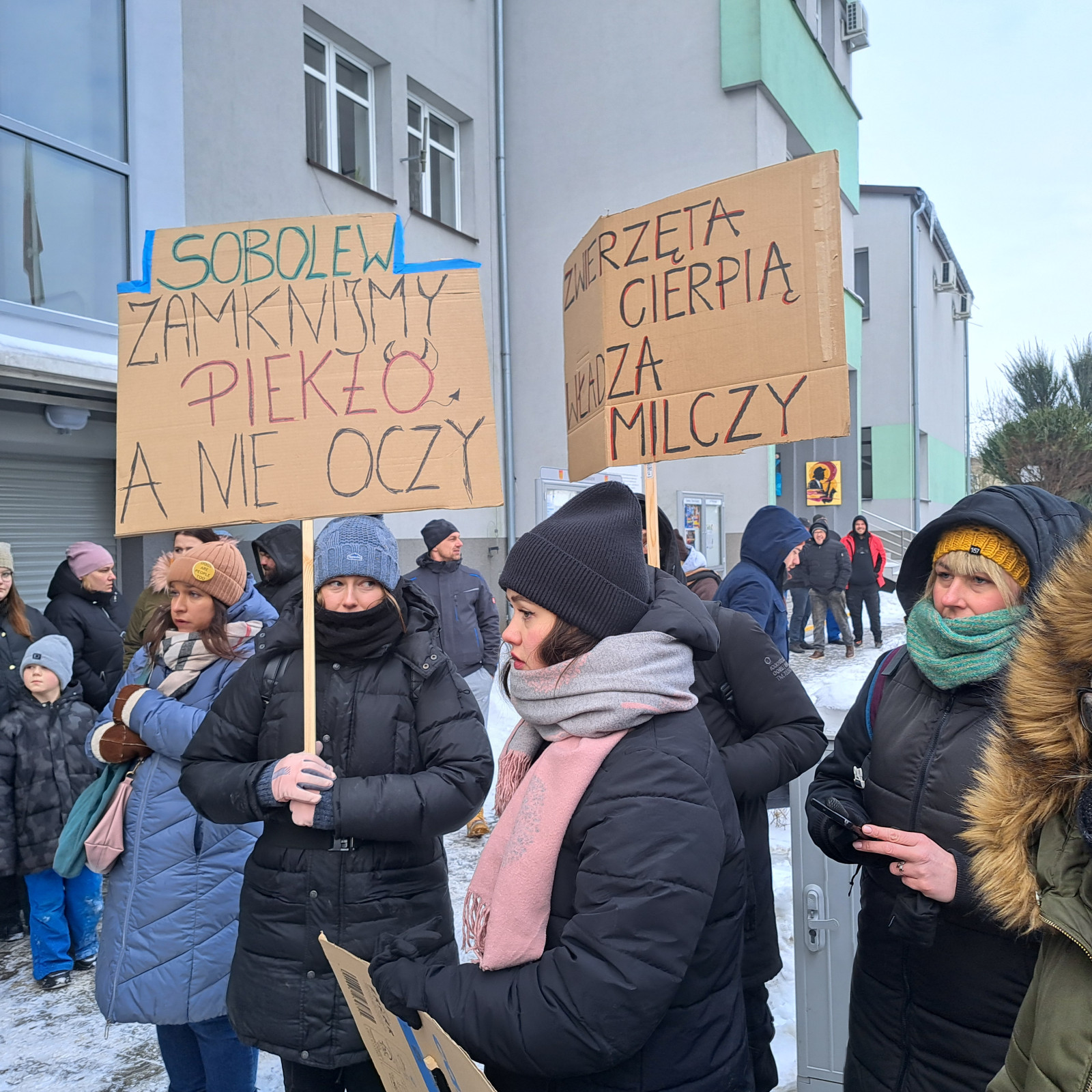 „To Auschwitz dla zwierząt! Mówimy dość umieralni!”. W Sobolewie odbył się protest przeciwko schronisku Happy Dog. Jego właściciel Marian D. w 2019 roku usłyszał zarzuty znęcania się nad zwierzętami. Placówka jednak cały czas działa, a psy mają być w złym stanie zdrowia, niewłaściwie karmione i bez zabezpieczenia przed mrozem. Aktywiści alarmują, że na miejscu od lat nie działa wolontariat, a adopcja zwierzaka jest niemal niemożliwa.