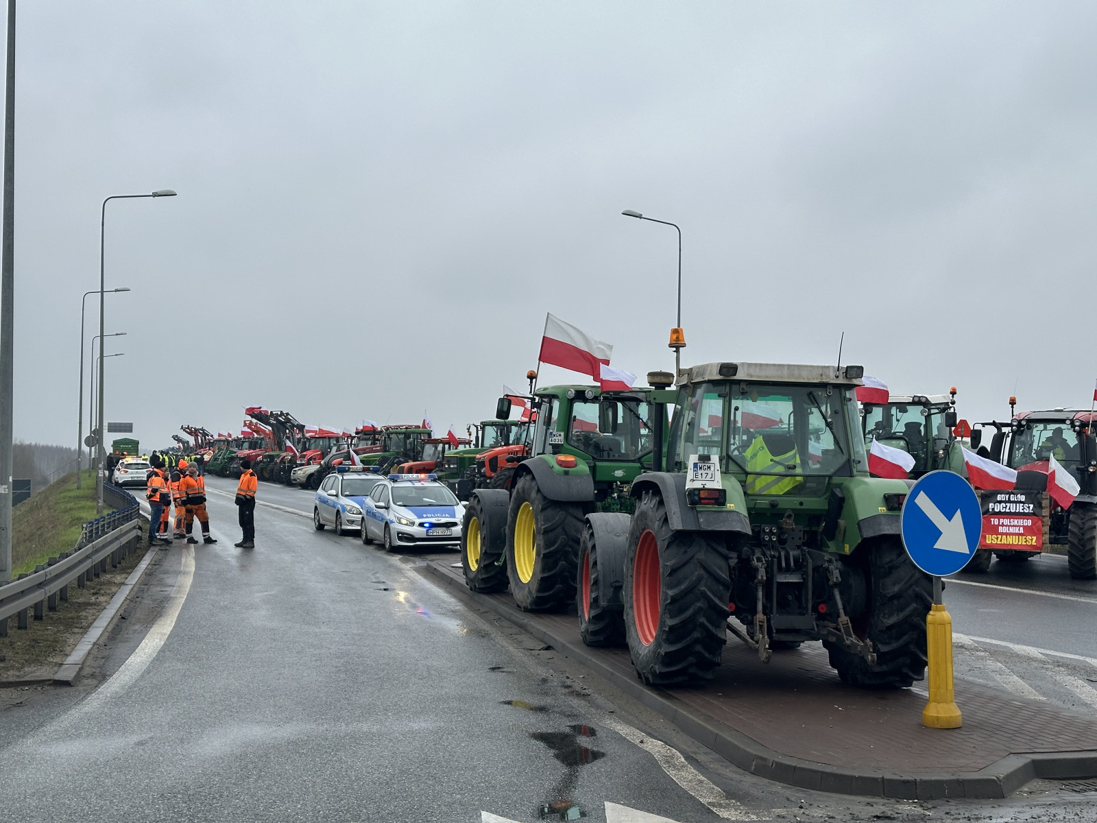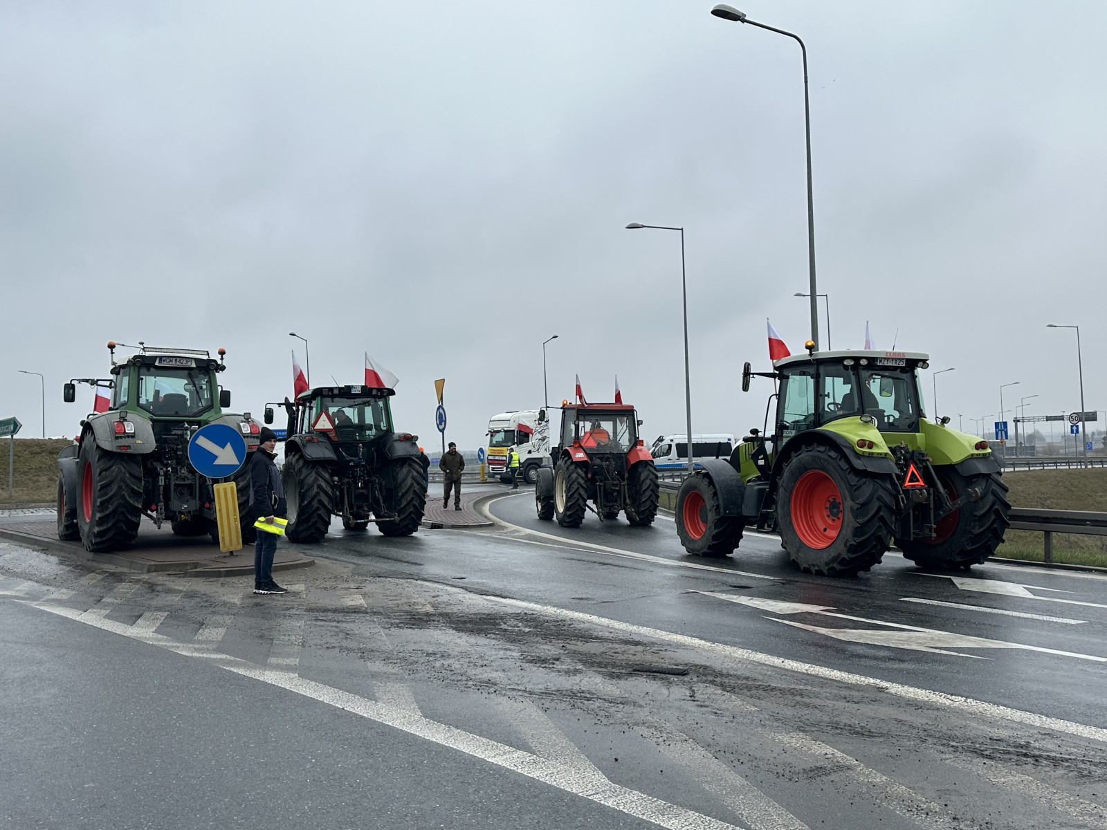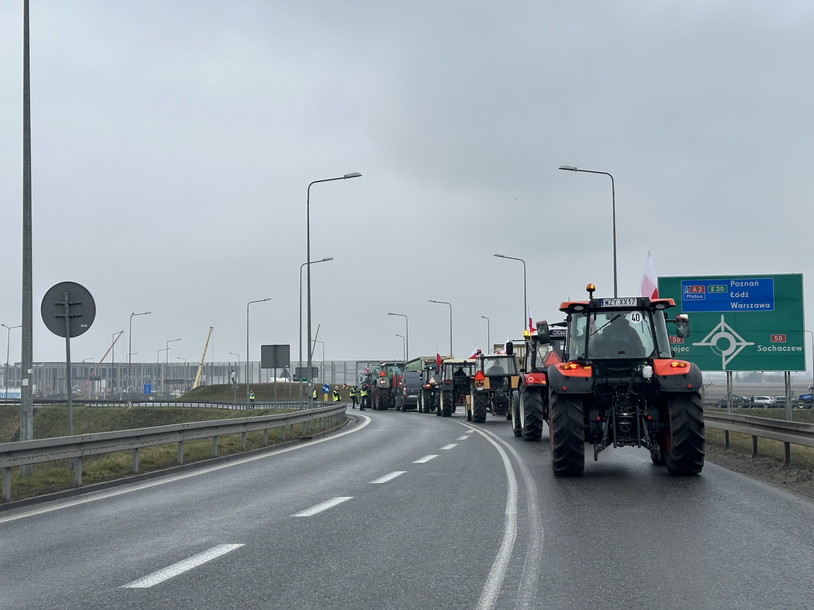 Kierowcy jadący z Sochaczewa nie przejadą przez węzeł na wysokości autostrady A2. Na rondzie zaparkowane są ciągniki z biało-czerwonymi flagami, a na samym środku skrzyżowania, wokół opalanego drewnem koksownika, stoją rolnicy w odblaskowych kamizelkach.