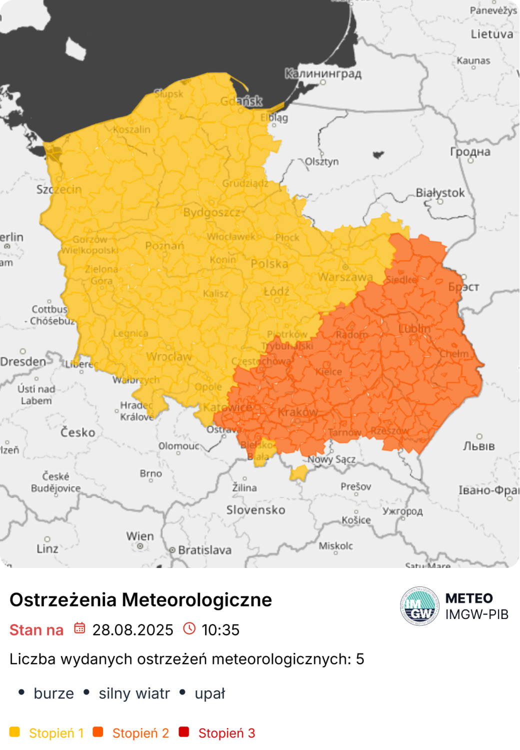 Alerty wydane przez IMGW obowiązują od godz. 12:00 do 20:00.