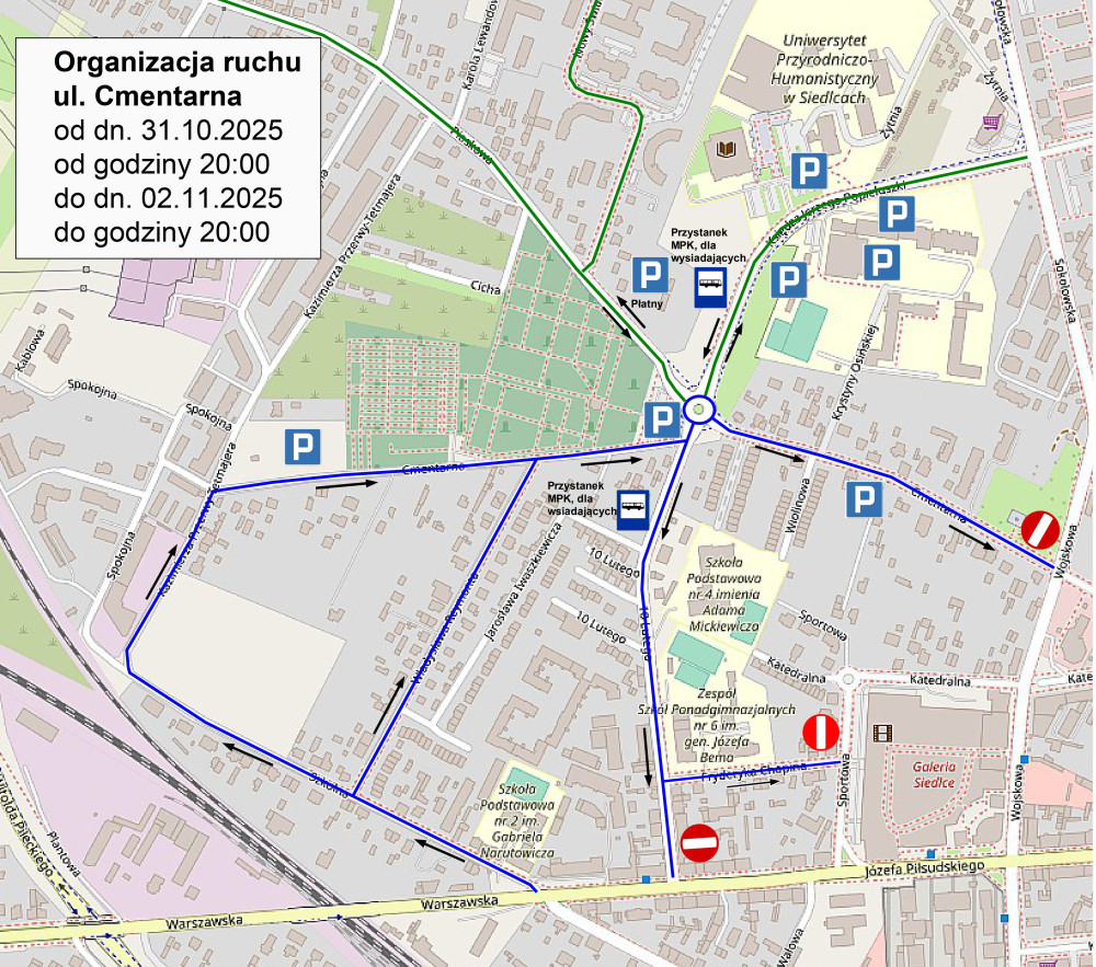 W Siedlcach tymczasowa organizacja ruchu w rejonie cmentarzy obowiązuje od 31 października od godziny 20:00 do 2 listopada do godziny 20:00.