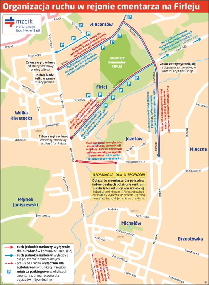 Do cmentarza na Firleju należy kierować się jedynie ulicą Warszawską i dalej Ofiar Firleja lub Witosa. Od ulicy Mieszka I będzie dojazd dla autobusów. Ulica Aleksandrowicza od szpitala do Warszawskiej też będzie dostępna dla komunikacji miejskiej lub karetek, dlatego pojazdy indywidualne nie będą mogły tamtędy jeździć.