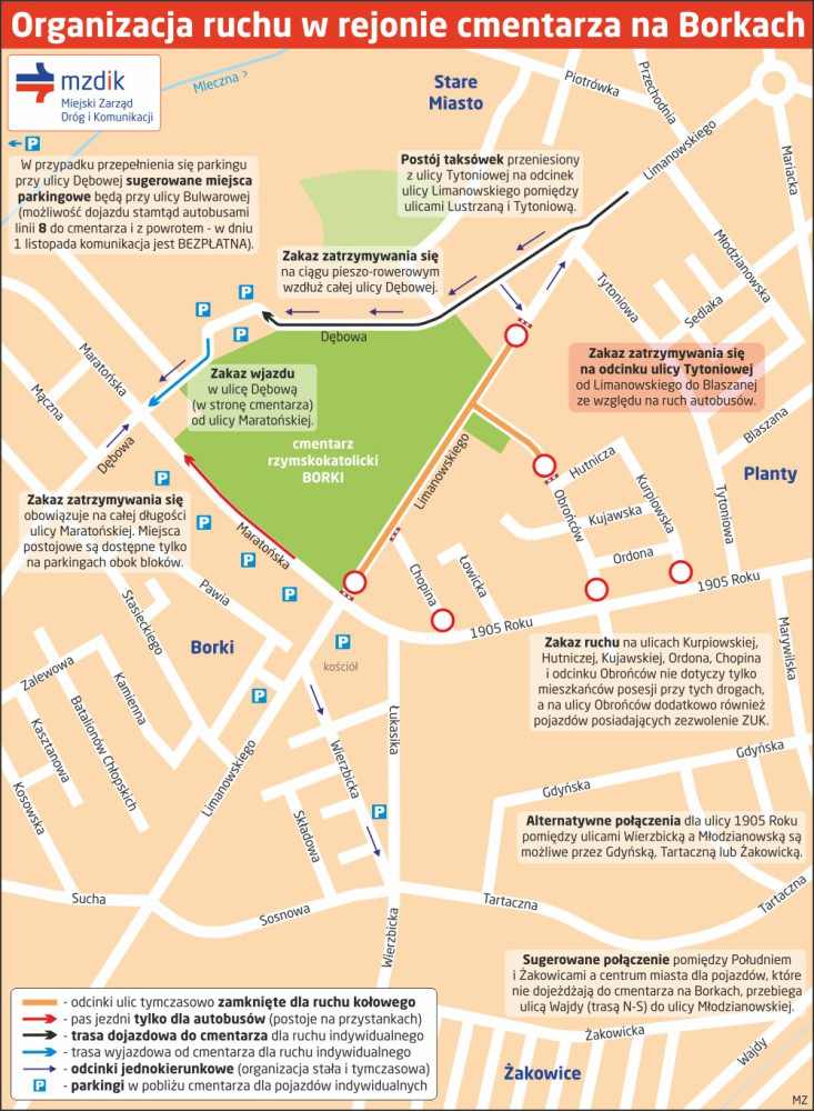 Tradycyjnie już dla ruchu zostanie zamknięty odcinek ulicy Limanowskiego między Tytoniową a Maratońską. Odcinki ulicy Dębowej za nekropolią i wzdłuż uniwersytetu będą jednokierunkowe w stronę ulicy Maratońskiej.