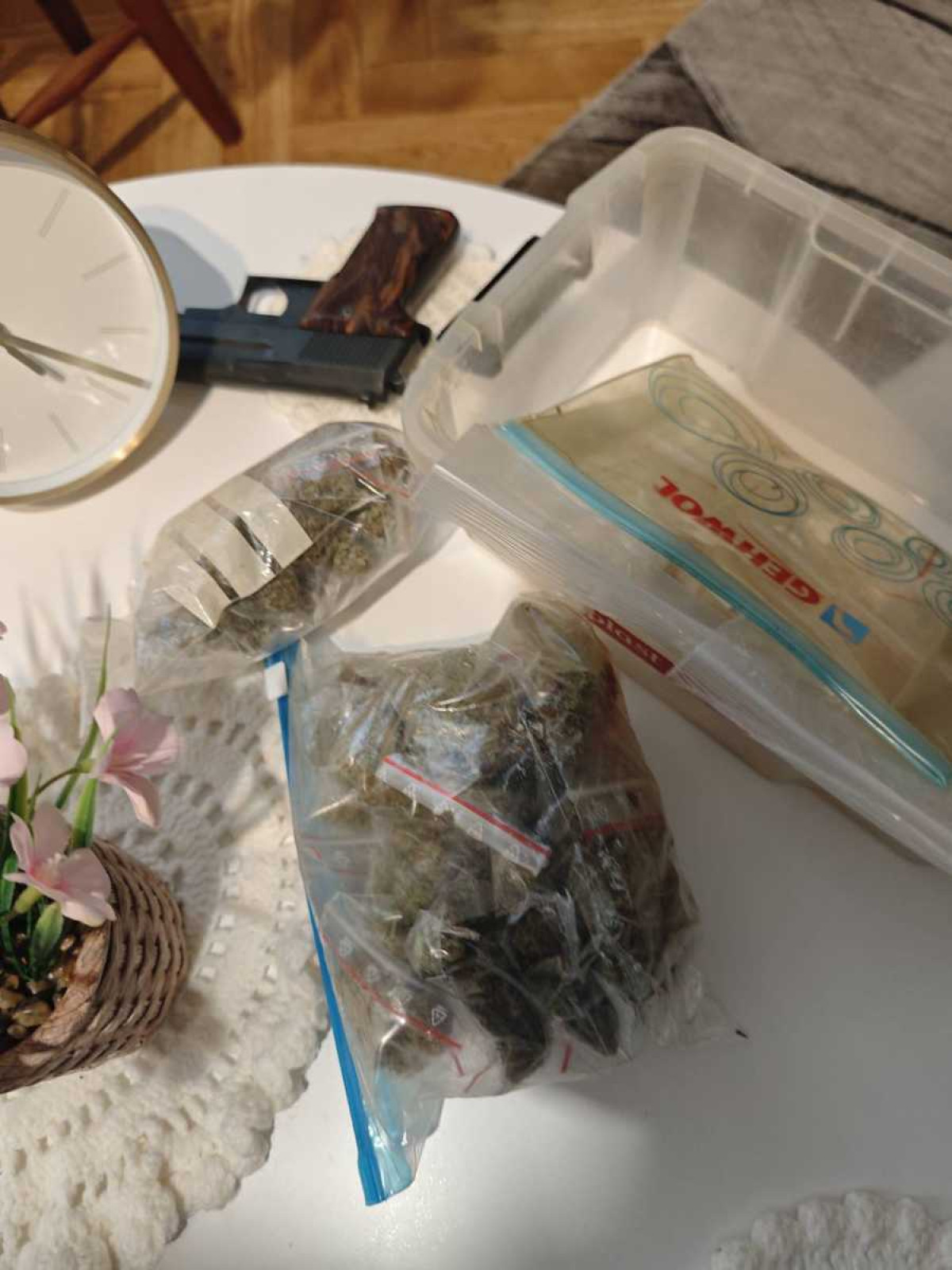 W trakcie przeszukania mundurowi znaleźli również pistolet hukowy, ponad 56 tys. zł w gotówce, elektroniczne wagi do porcjowania narkotyków oraz ponad 9 tys. sztuk papierosów bez polskich znaków akcyzy o szacunkowej wartości 14 tys. zł.