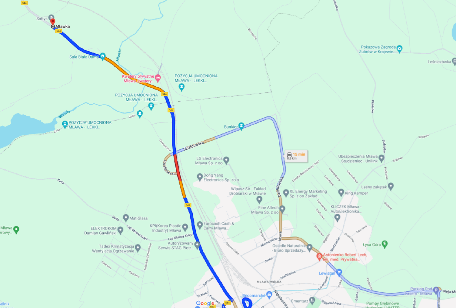 Jak informowała miejscowa policja, droga była całkowicie zablokowana. Od strony Mławy wyznaczono objazd w kierunku dzielnicy przemysłowej, a dalej w stronę DW-7 (stara „siódemka”). Od strony Działdowa kierowcy jechali objazdem w Białutach w kierunku DW-7.