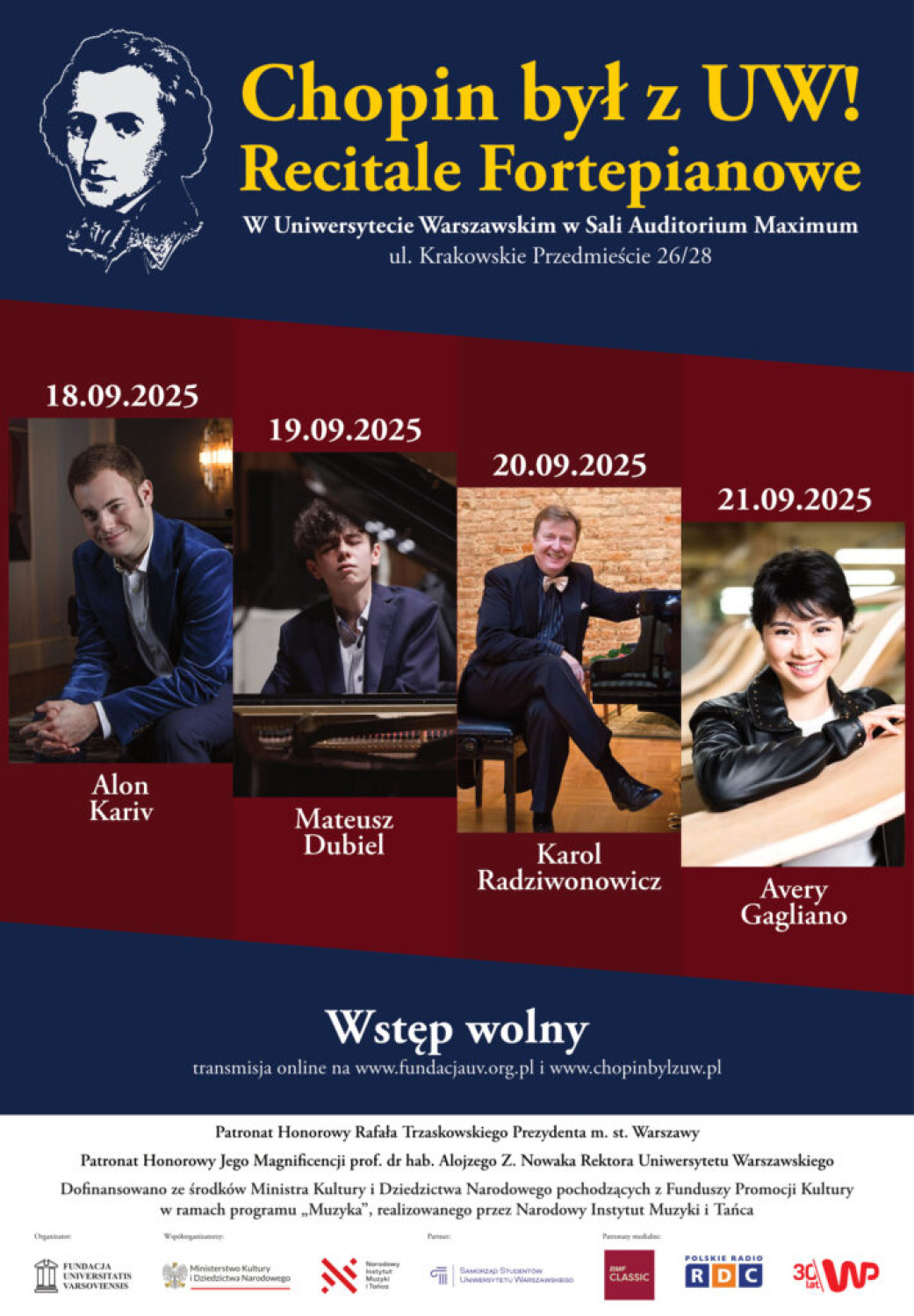 Od czwartku do niedzieli (18-21.09), co wieczór o godzinie 18:00, w murach Uniwersytetu Warszawskiego wybrzmiewać będą najsłynniejsze utwory Fryderyka Chopina w wykonaniu znakomitych pianistów z Polski i reszty świata. To 10. jubileuszowa edycja spotkań z mistrzowską muzyką – wszystkie cztery koncerty cyklu będzie można usłyszeć na antenie Polskiego Radia RDC.