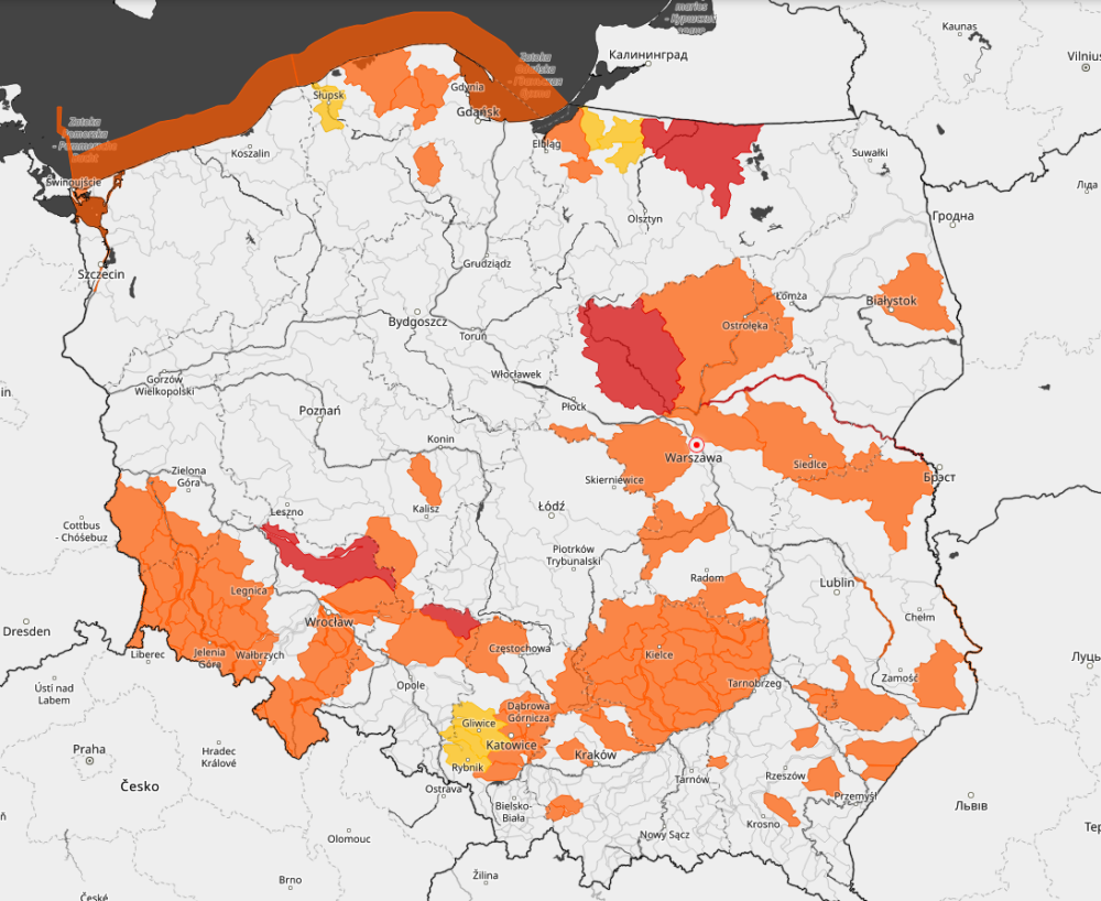 Alerty drugiego stopnia wydano dla rzeki Wkry (woj. mazowieckie), Pilicy (woj. świętokrzyskie), Brynicy (woj. śląskie), Stobrawy (opolskie) i Widawy (dolnośląskie). Na tych rzekach hydrolodzy prognozują wzrost poziomu wody i przekroczenia stanów ostrzegawczych. Alerty obowiązują do czwartku do godz. 18.