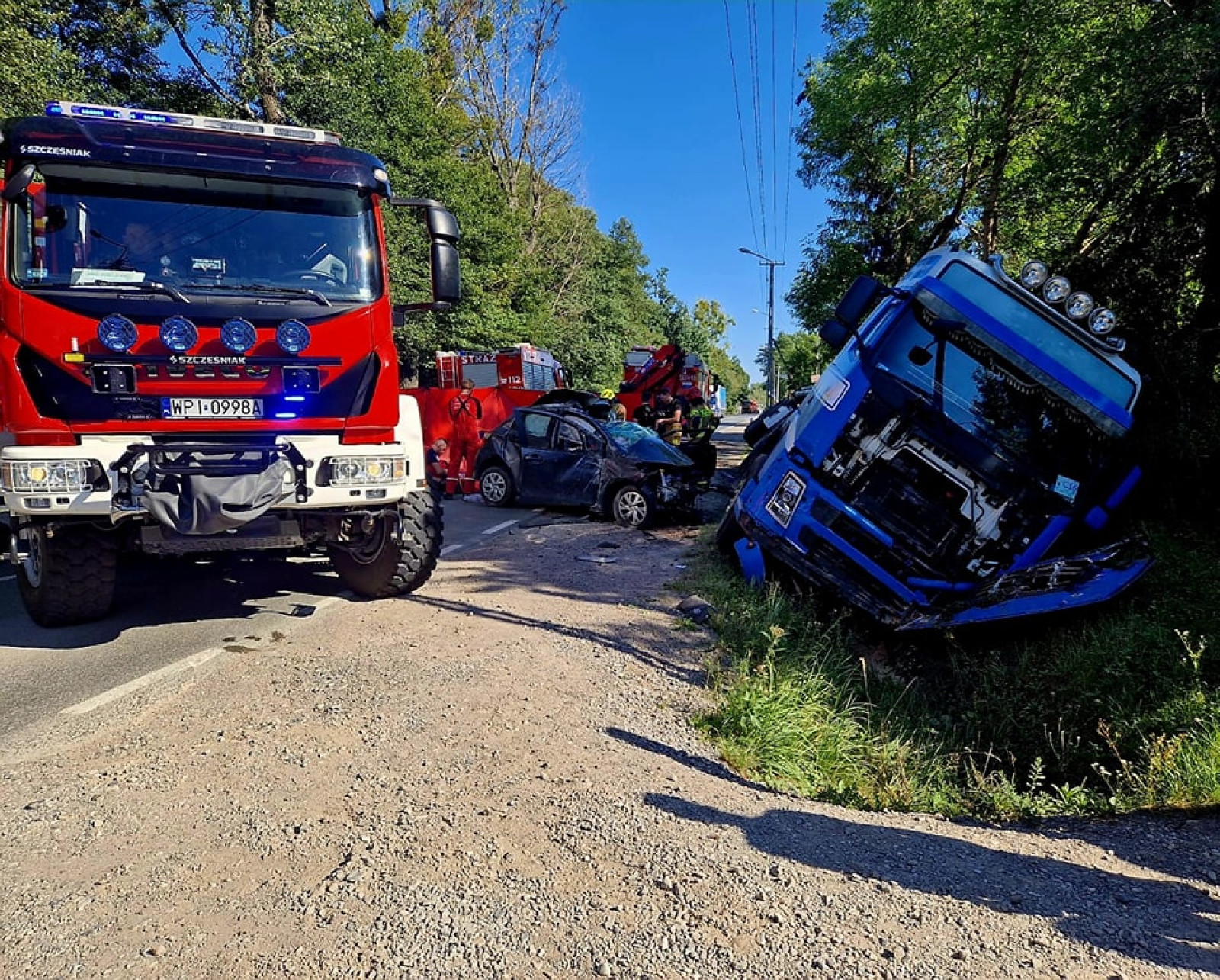 W zdarzeniu wzięły udział grafitowa Toyota Yaris oraz samochód ciężarowy z ciągnikiem siodłowym marki Volvo koloru niebieskiego z białą naczepą do przewozu betonu.