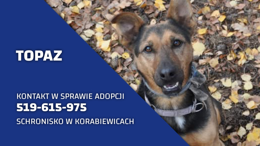 Topaz to uroczy pies, który przyjechał do Korabiewic z przytuliska. Waży około 19 kg i urodził się ok. 2019 roku.