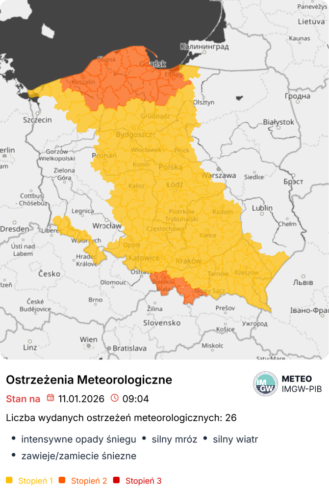 Instytut Meteorologii i Gospodarki Wodnej wydał ostrzeżenia I stopnia przed intensywnymi opadami śniegu dla woj. kujawsko-pomorskiego, części woj. łódzkiego, południowej części woj. podkarpackiego i dla zachodniego Mazowsza.
