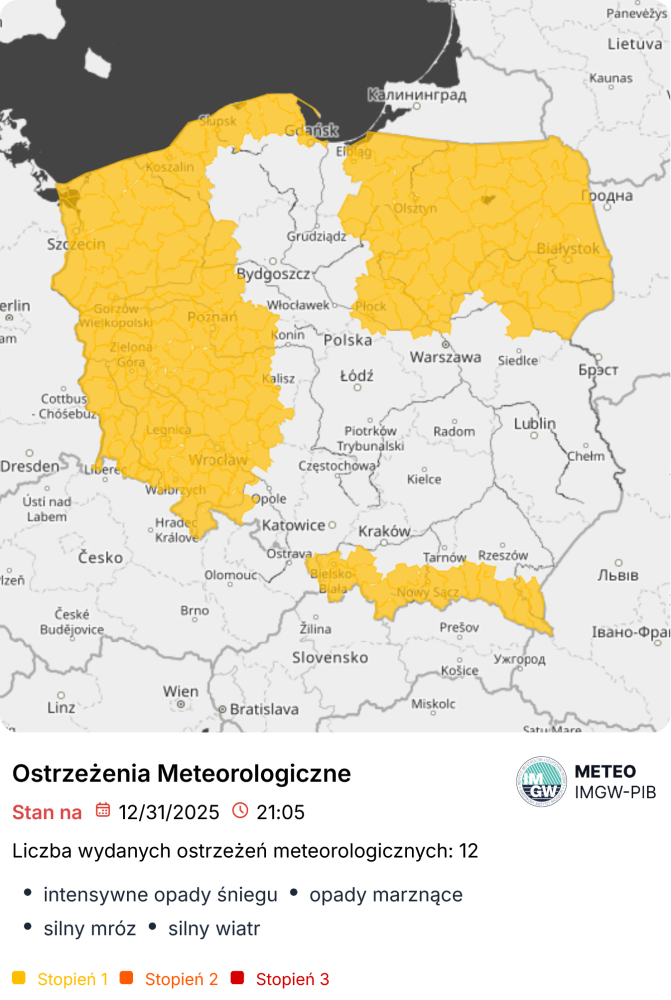 Środa była kolejnym dniem z trudnymi warunkami pogodowymi w kraju. IMGW poinformował, że w zachodniej części kraju od wieczora obowiązywać będą alerty I stopnia przed opadami marznącymi. Ostrzeżenia wydano dla województwa zachodniopomorskiego, lubuskiego, dolnośląskiego, części wielkopolskiego i opolskiego. Pozostaną w mocy do 1 stycznia do godz. 6.00.