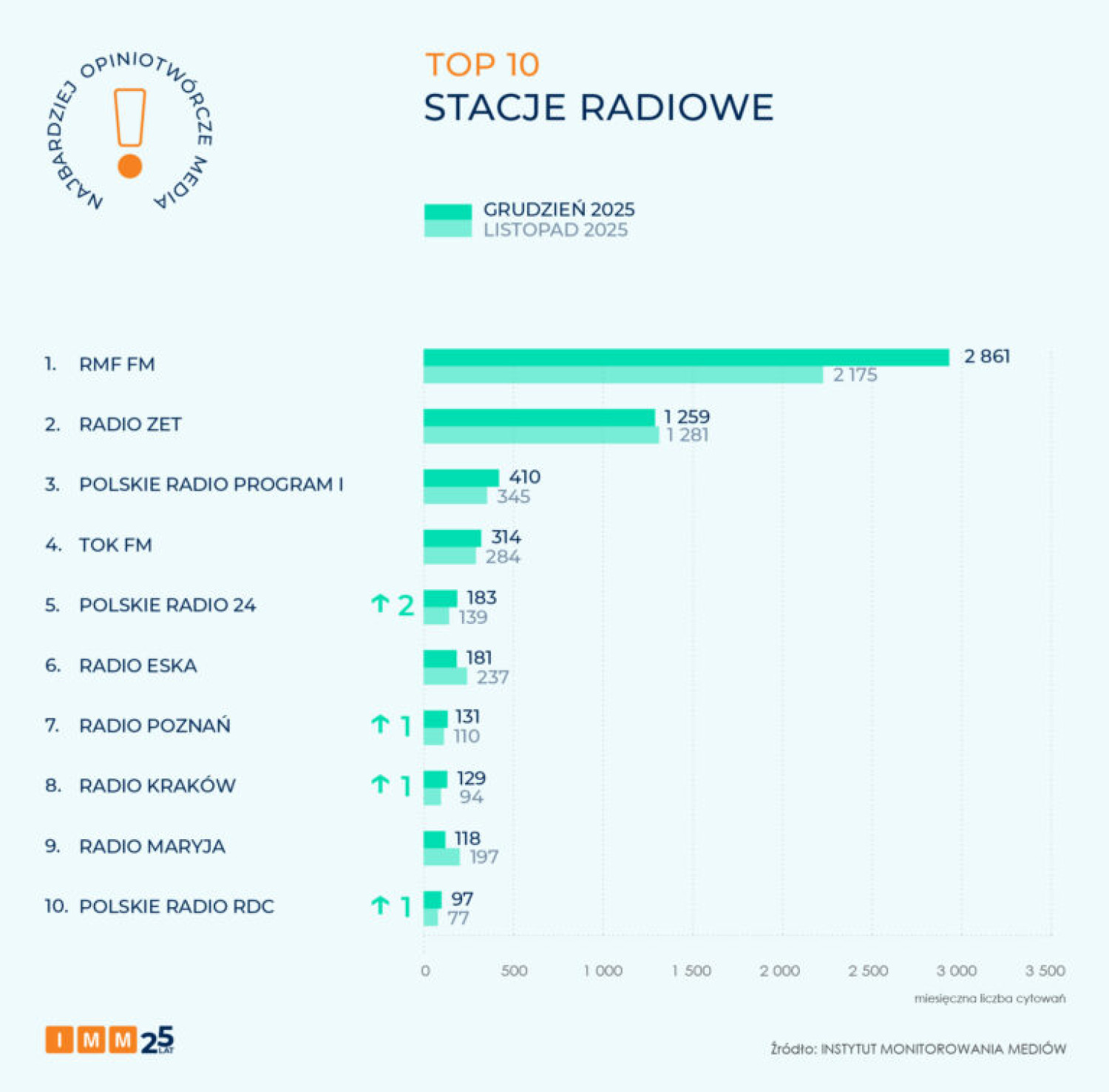 Polskie Radio RDC drugi raz z rzędu znalazło się w pierwszej dziesiątce najbardziej opiniotwórczych stacji radiowych. Zestawienie przygotował Instytut Monitorowania Mediów. Badanie dotyczy okresu 1–31 grudnia 2025 roku.