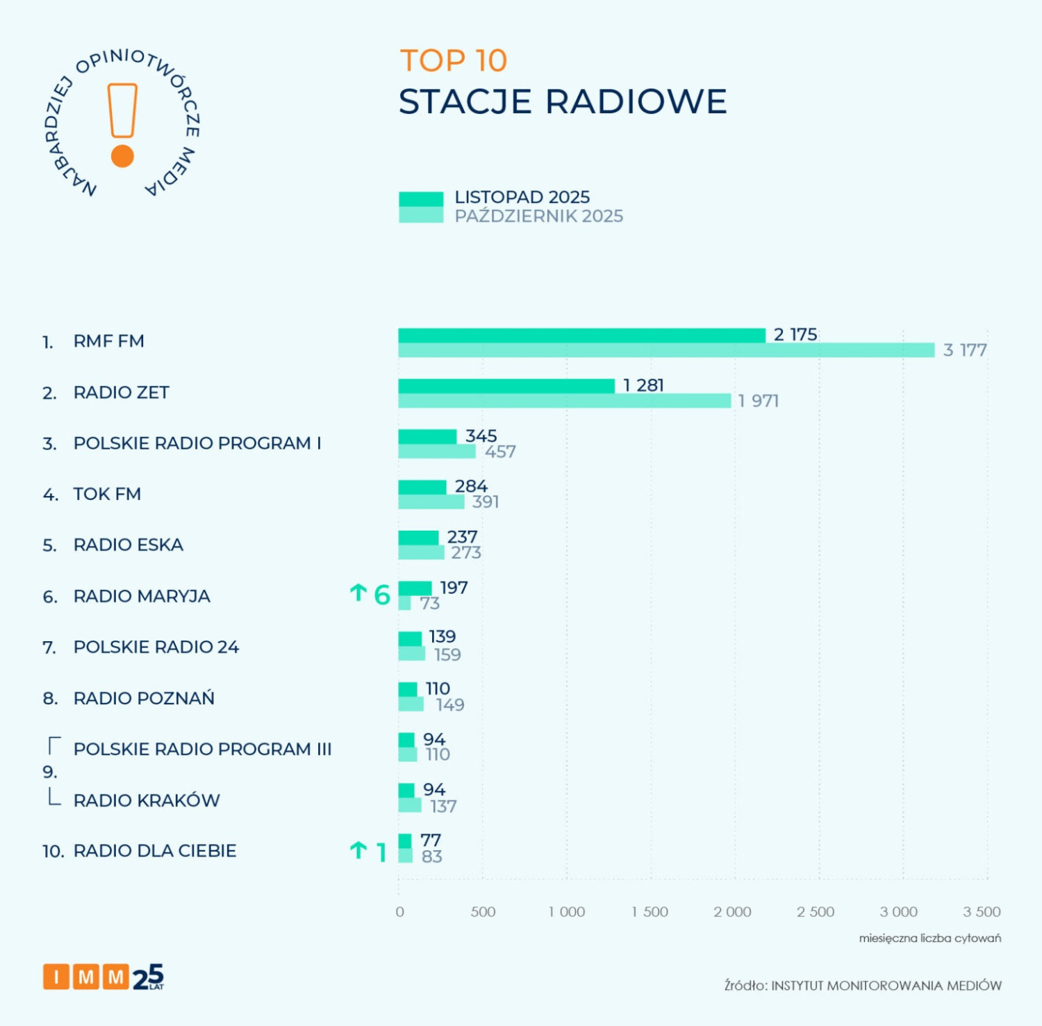 Polskie Radio RDC znalazło się w pierwszej dziesiątce najbardziej opiniotwórczych stacji radiowych. Zestawienie przygotował Instytut Monitorowania Mediów. Badanie dotyczy okresu 1–30 listopada 2025 roku. Wśród naszych materiałów, które cieszyły się największym zainteresowaniem, były m.in. utrudnienia drogowe w Warszawie w związku z zamkniętymi stacjami metra.