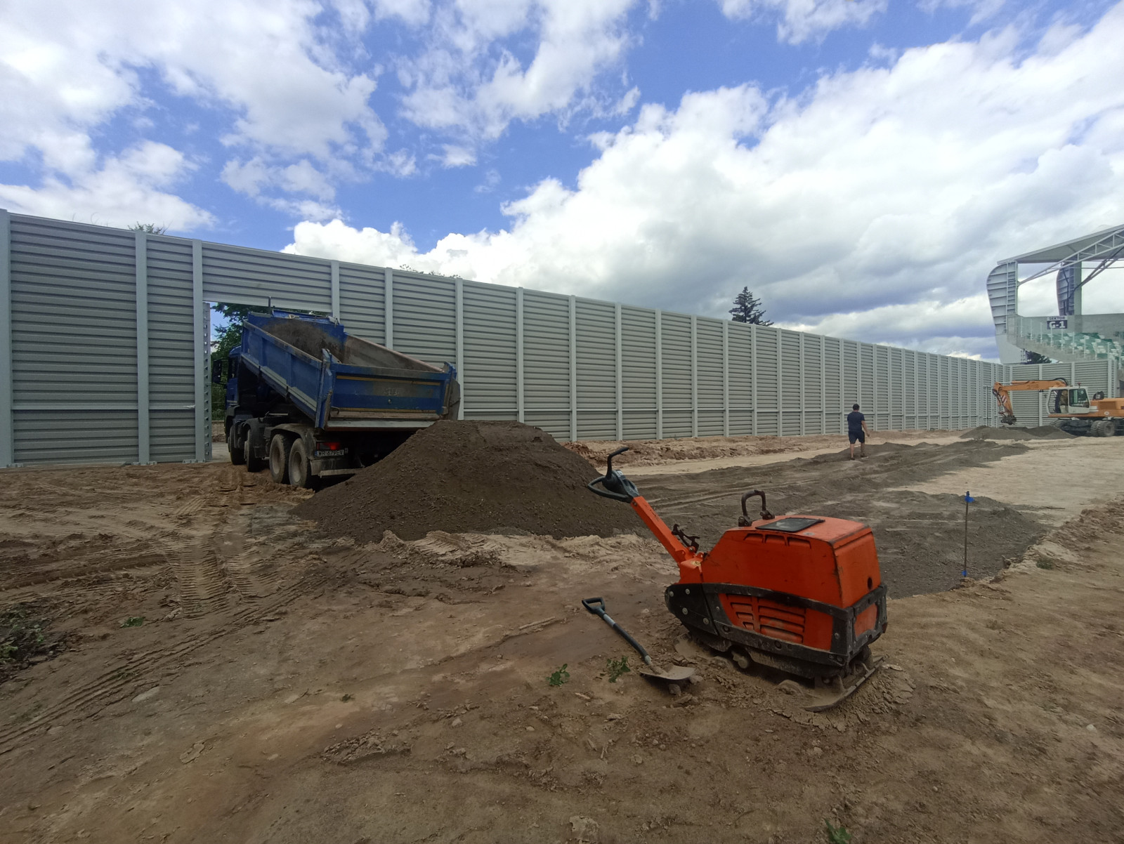 Trwają intensywne przygotowania do sobotniego meczu Radomiaka z Cracovią na nowym stadionie Radomskiego Centrum Sportu. Jednak odbędzie się on jeszcze bez kibiców gości. Na zlecenie klubu, za zachodnią bramką od strony ulicy Jordana, odbywają się prace budowlane pod trybunę dla kibiców przeciwnych drużyn. Utwardzenie podłoża wykonuje firma zewnętrzna.