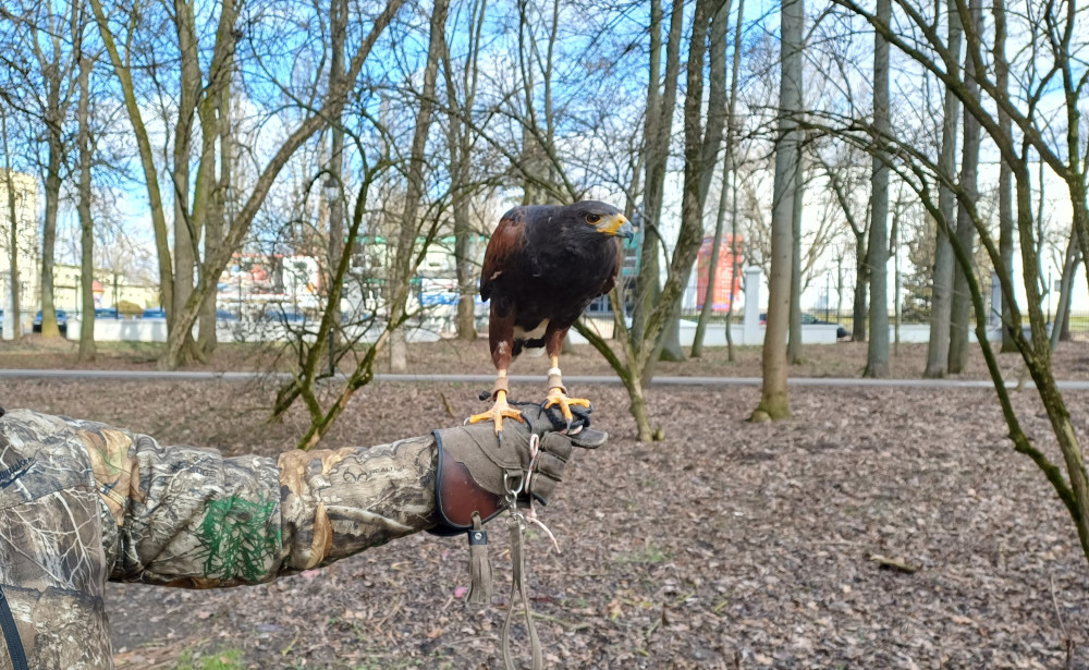 W parku miejskim w Siedlcach pracuje Grażyna. To 5-letni jastrząb, przy pomocy którego do 15 marca potrwa tam płoszenie gawronów i gołębi.