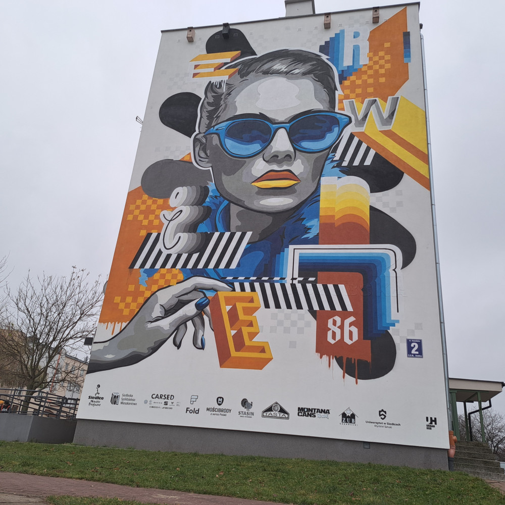 Koniec z szaroburym blokowiskiem – Siedlce mają nowy ogromny mural. Na ścianie bloku przy ul. Kaszubskiej pojawił się wizerunek młodej kobiety. Do tego geometryczne kształty i intensywne kolory, niebieski i pomarańcz.