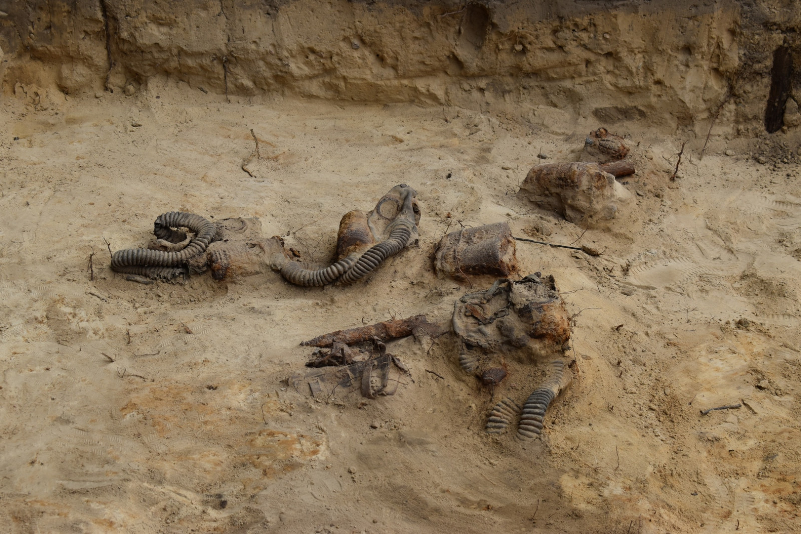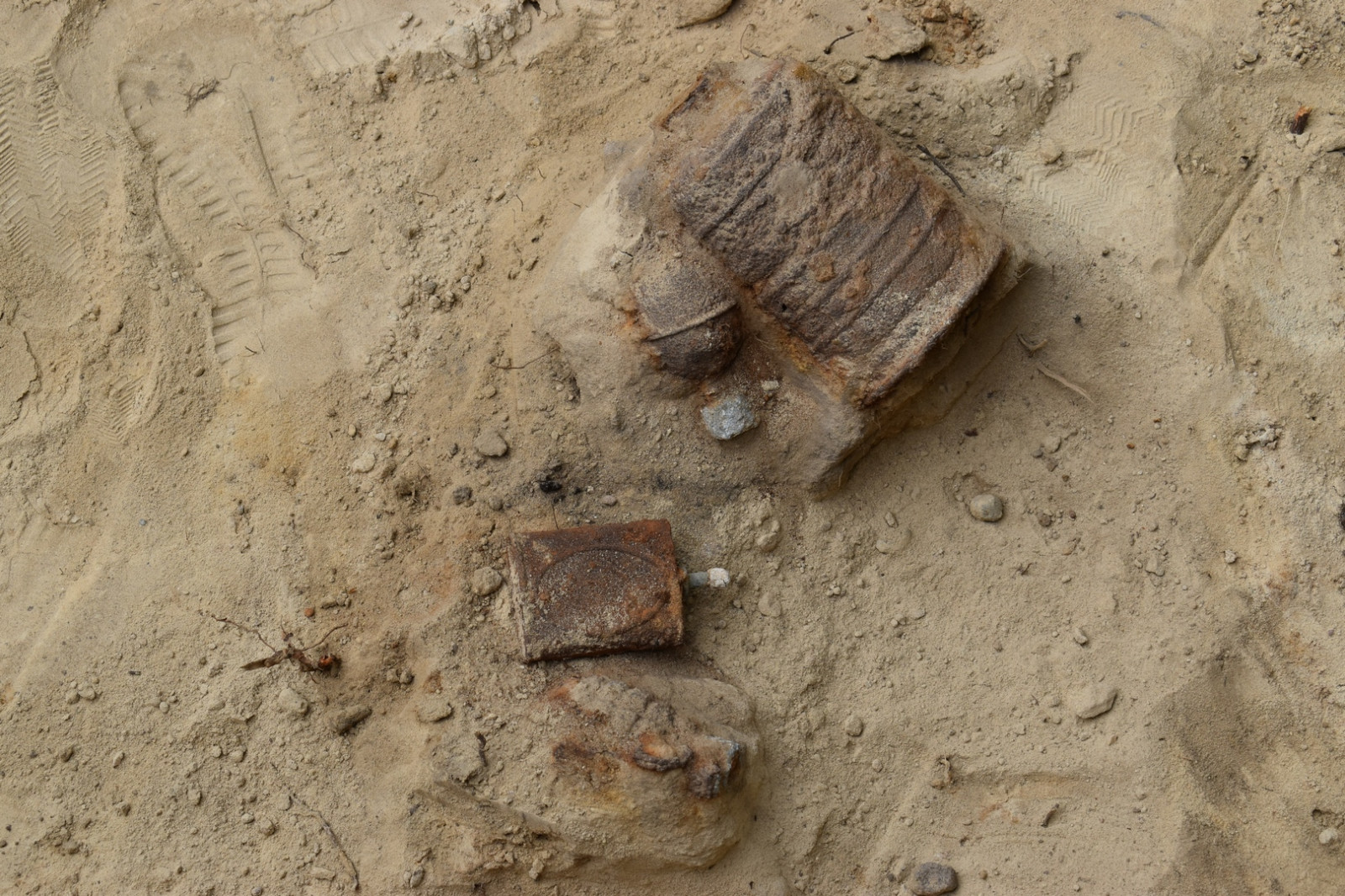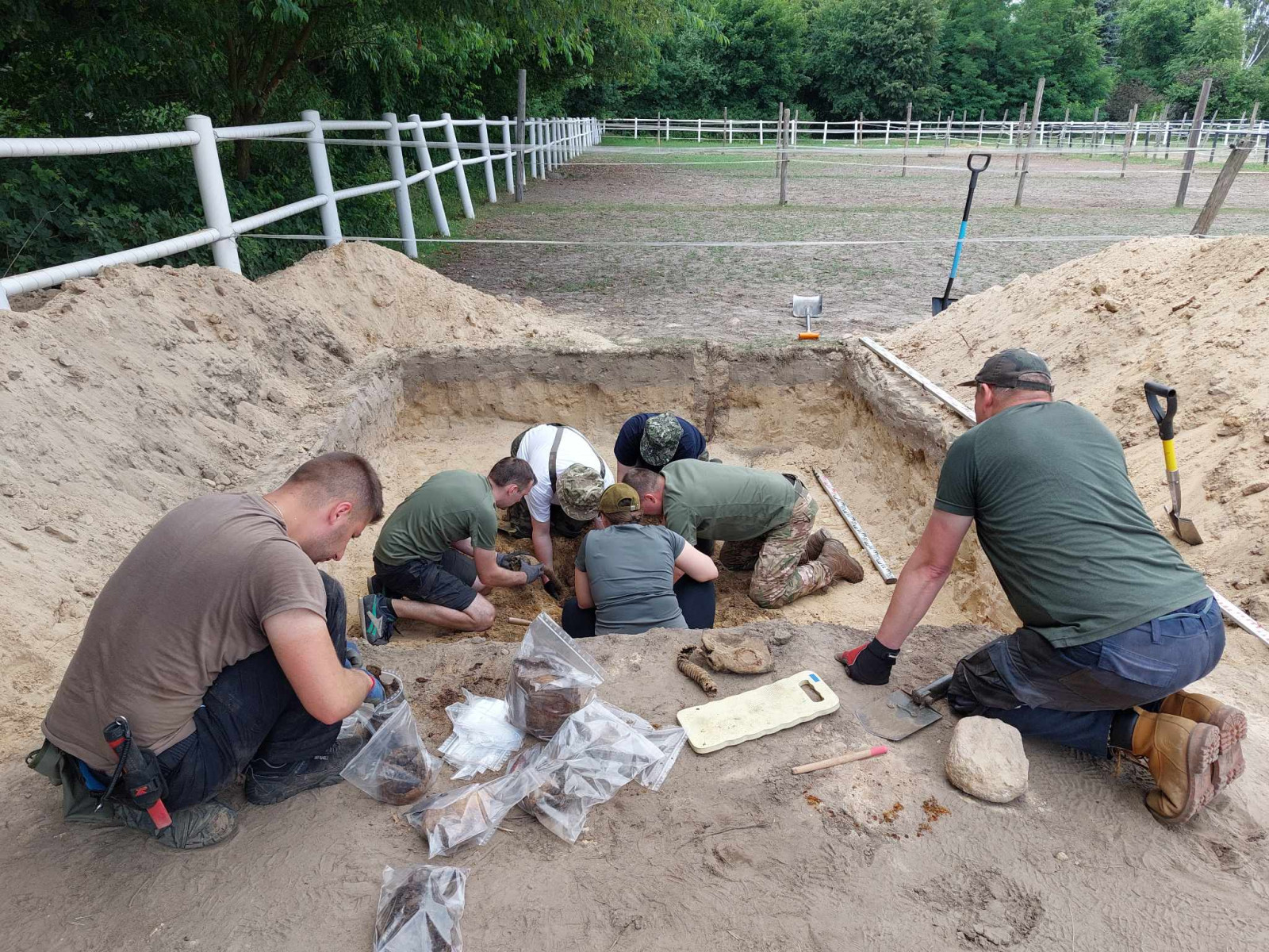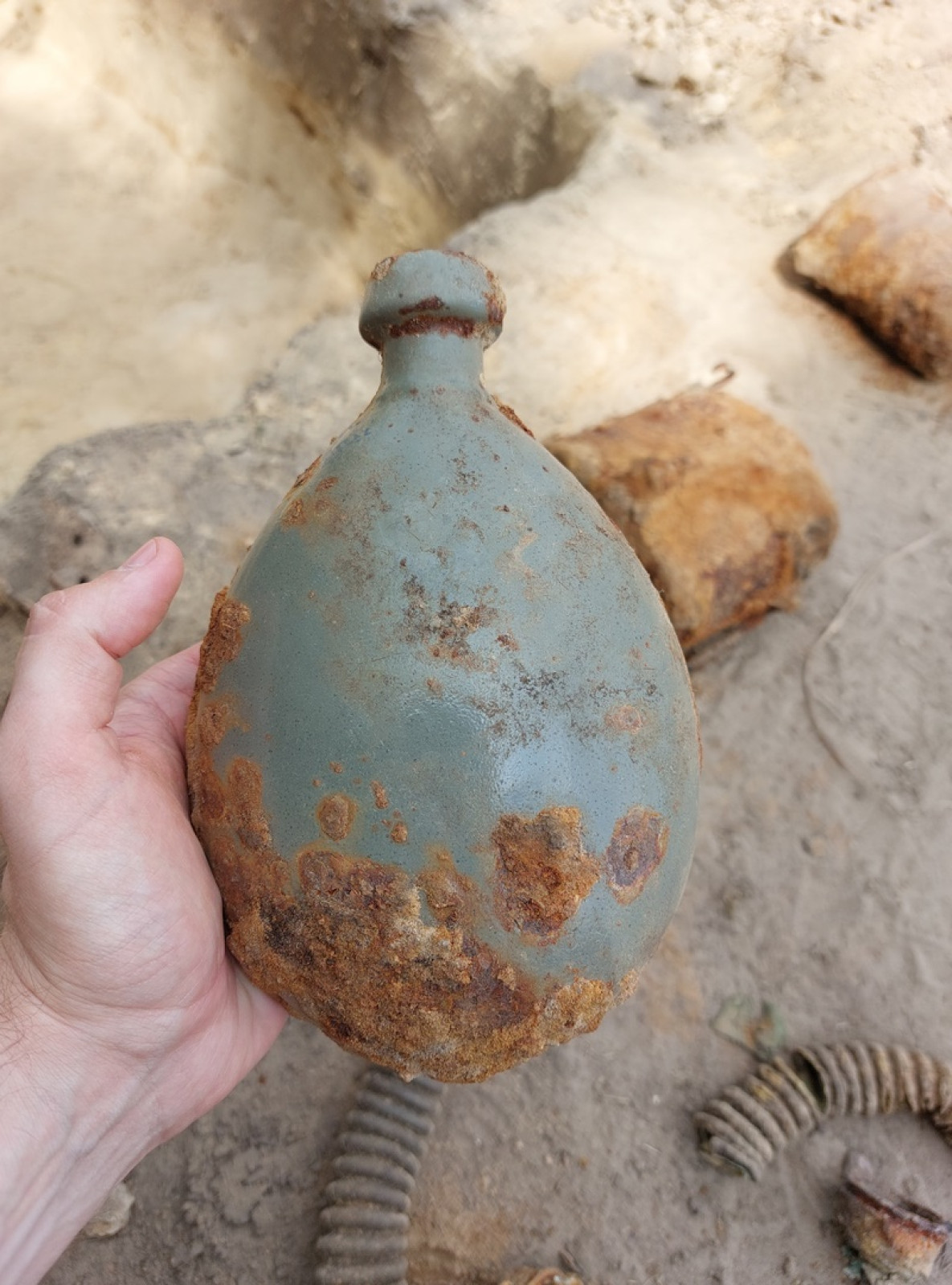 W trakcie badań natrafiono na dwa granaty — zaczepny wz. 24 i obronny wz. 33. Ze względu na obecność materiałów niebezpiecznych, na miejsce wezwana została Policja, a następnie saperzy, którzy po dokonaniu czynności służbowych umożliwili dalsze prowadzenie badań.