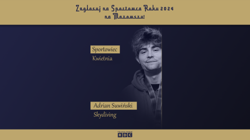 ADRIAN SUWIŃSKI, skydiver – został Sportowcem Kwietnia. Zawodnik reprezentujący warszawsko-wrocławską drużynę Flyspot Synapses uprawia niezwykle widowiskowy sport – indoor skydyving, czyli akrobacje w tunelu aerodynamicznym. Polska ekipa świetnie spisała się w zawodach w Makau. Wywalczyła Puchar Świata i dodatkowo mistrzostwo Europy w lataniu wertykalnym, czyli nogami w dół.