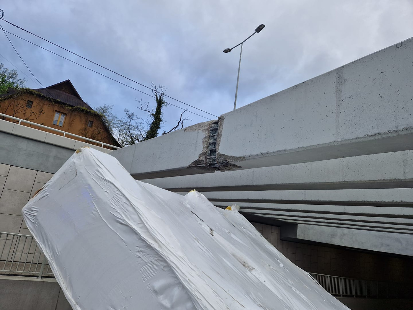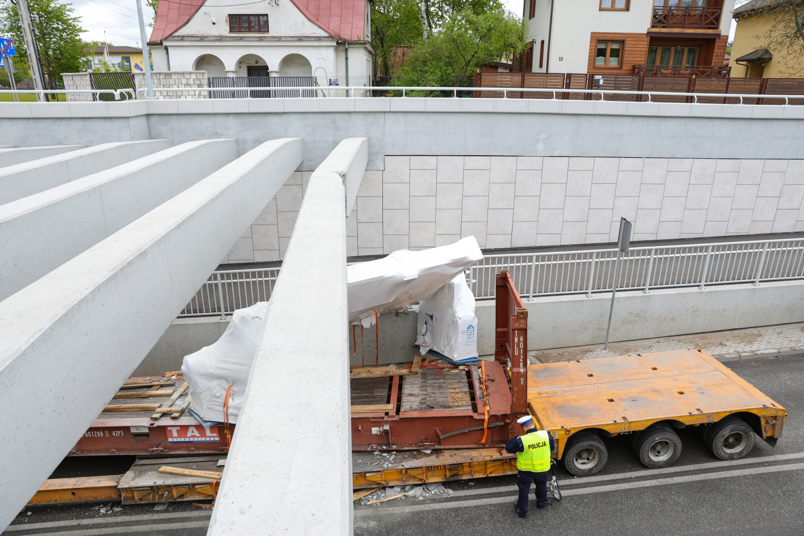 Cały ładunek spadł z naczepy tira i uszkodził jedną z żelbetonowych belek.