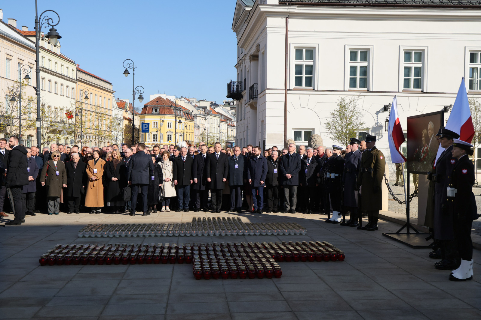 Przed Pałacem Prezydenckim – w miejscu, gdzie 10 kwietnia 2010 roku gromadzili się mieszkańcy Warszawy – ustawiono pęknięty krzyż z białych i czerwonych zniczy. Za nim umieszczono zdjęcie pary prezydenckiej Marii i Lecha Kaczyńskich.