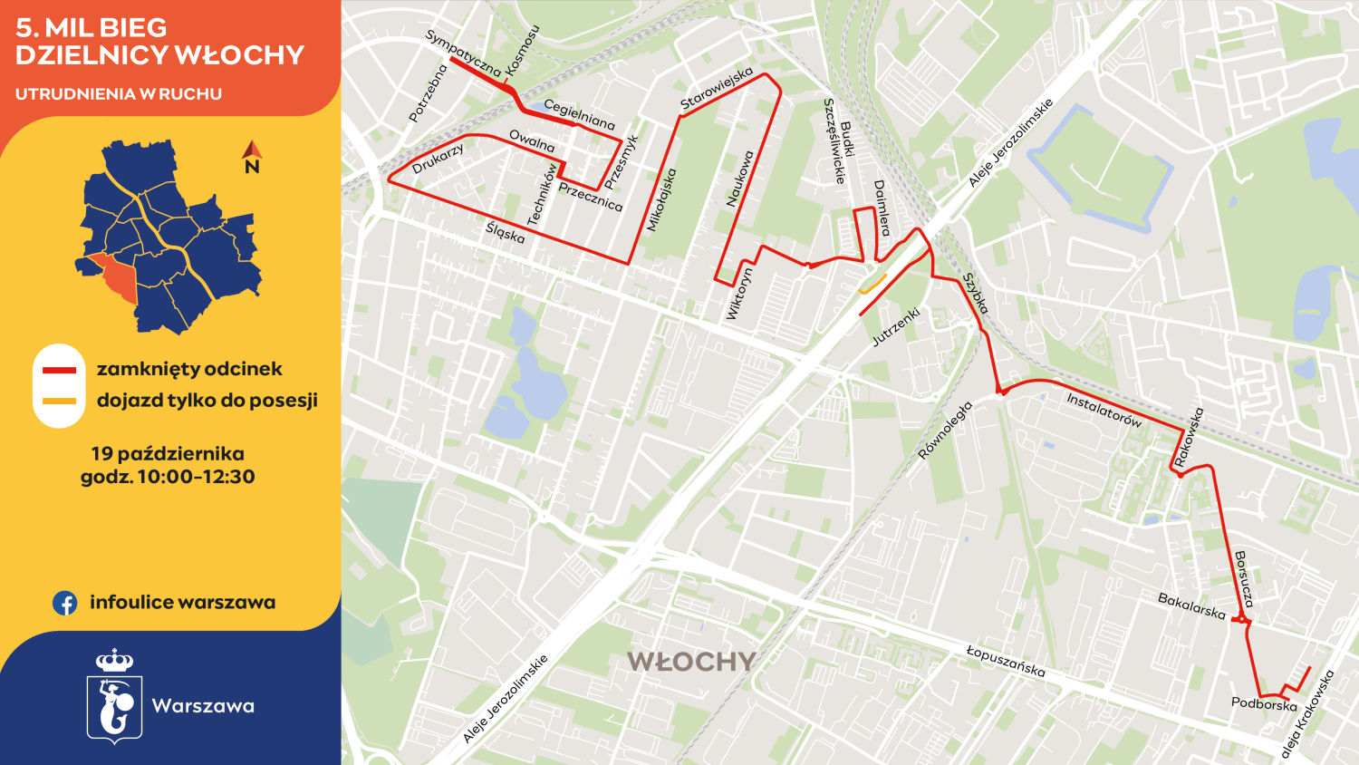 W czasie biegu będą zamknięte wszystkie wyjazdy z osiedli i wloty ulic łączących się bezpośrednio z trasą. Policjanci w miarę możliwości będą przepuszczali mieszkańców osiedla Stare Włochy jadących ulicami: Dziupli, Płużańską, Składową, Stawy i Techników.
