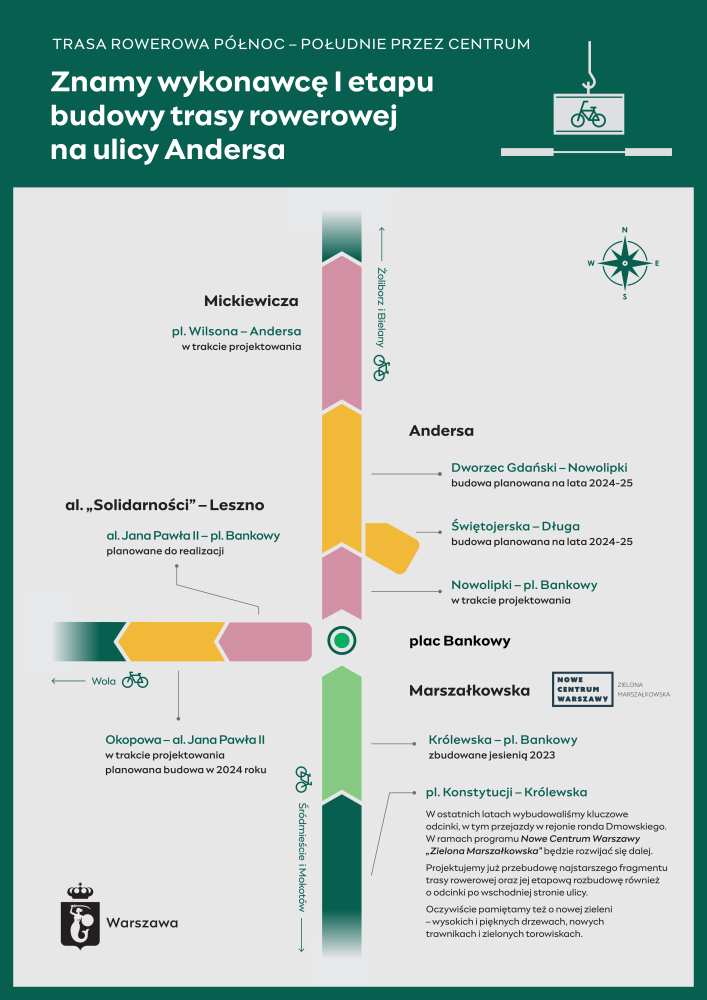 Jeszcze w tym roku ruszą prace nad przebudową ulicy Andersa w Warszawie. To ma być największa w tym roku inwestycja rowerowa w stolicy i kluczowy odcinek dla całej śródmiejskiej sieci. Zgodnie z wcześniejszymi zapowiedziami prace będą się toczyć w latach 2024–25, a wykona je warszawska firma Wegarten.