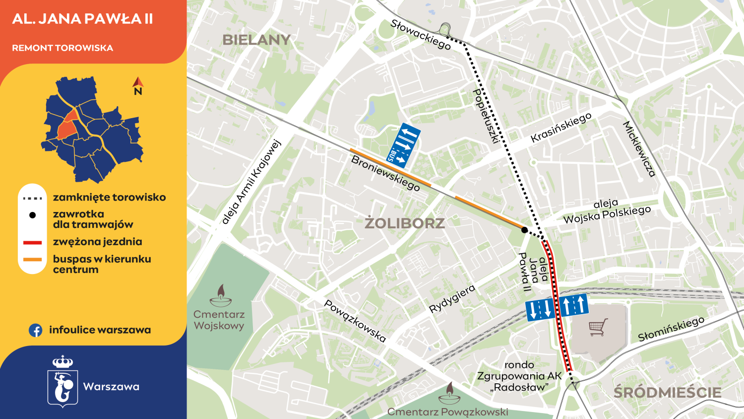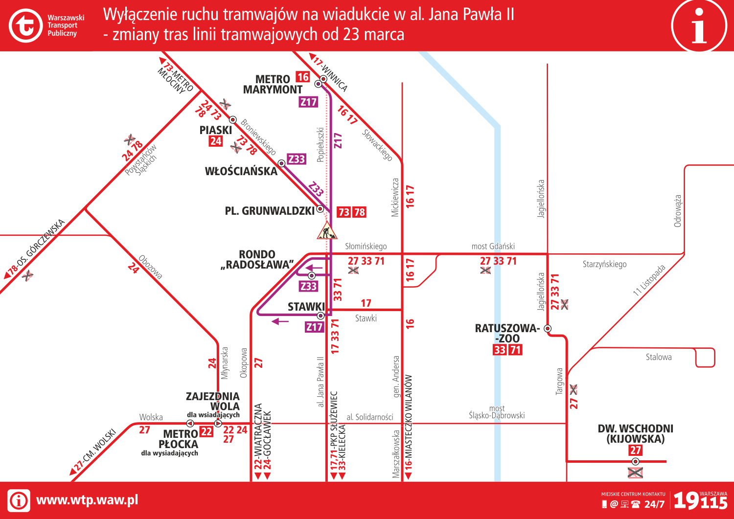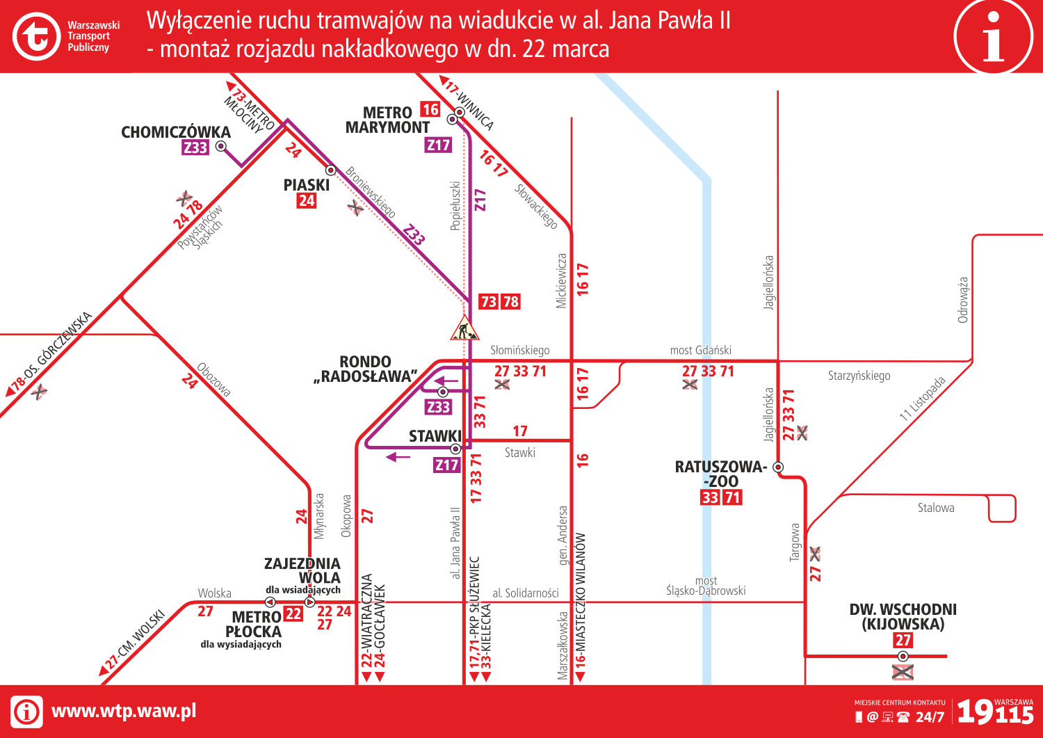 Roboty wymuszą przerwę w kursowaniu tramwajów w ciągu al. Jana Pawła II i Popiełuszki na odcinku pomiędzy przystankami Metro Marymont i Rondo Radosława. Nie będą kursowały tramwaje linii 28, a 16, 17, 22, 27 i 33 oraz 24 zmienią swoje trasy w obydwu kierunkach. Uruchomione zostaną autobusowe linie zastępcze Z17 i Z33 oraz trzy tramwajowe linie uzupełniające 71, 73 i 78.