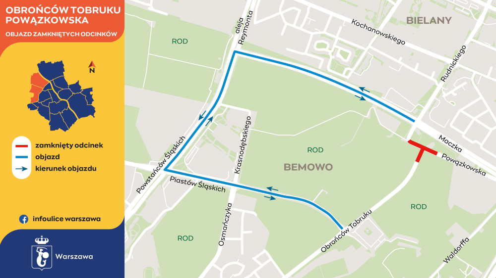 Prace rozpoczną się w środę, 26 lutego, z samego rana. Skrzyżowanie Obrońców Tobruku i Powązkowskiej zostanie zamknięte. Utrudnienia będzie można ominąć ulicami: Maczka, Powstańców Śląskich i Piastów Śląskich.