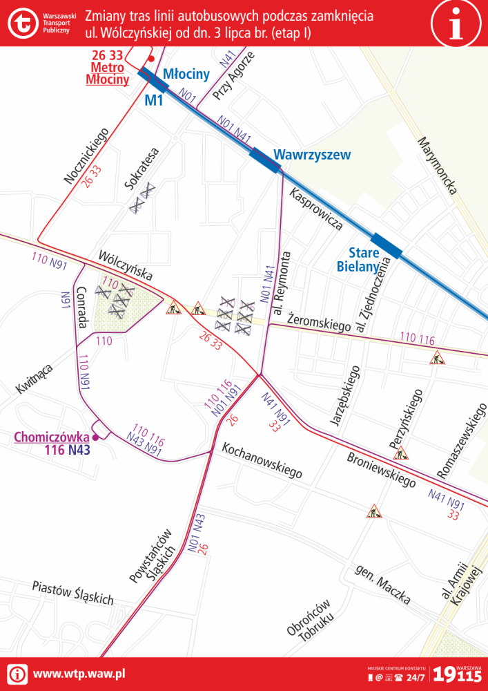 Linia autobusowa 110 ominie utrudnienia aleją Reymonta i ulicami Conrada i Kwitnącą. Tak samo, ale nie wjeżdżając w ulicę Kwitnącą, pojadą autobusy 116 i N91. Linie N01 i N41 będą kursowały aleją Reymonta i ulicą Kasprowicza. Nocny N43, tylko w kierunku Chomiczówki, pojedzie ulicą Conrada.