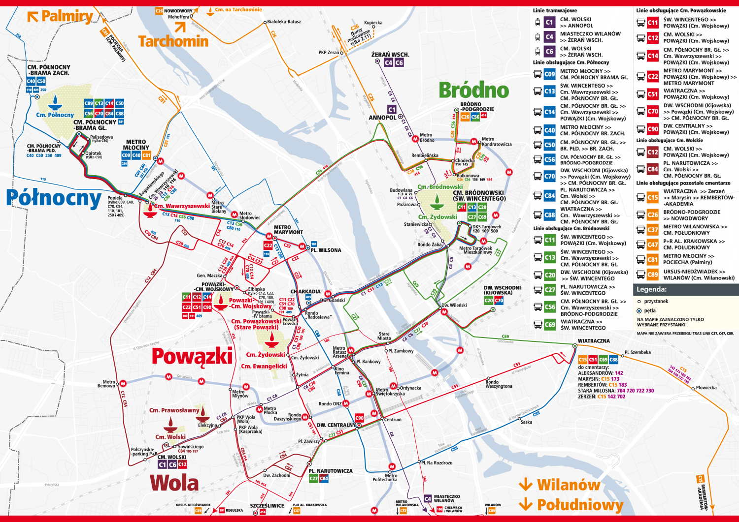 W sobotę i niedzielę będzie obowiązywała specjalna organizacja ruchu w rejonie wszystkich większych, warszawskich cmentarzy. Zostaną uruchomione dodatkowe linie tramwajowe C1, C4 i C6 oraz autobusowe C09, C11, C12, C13, C14, C15, C20, C22, C26, C27, C37, C40, C47, C50, C51, C56, C69, C70, C81, C84, C88, C89, C90.