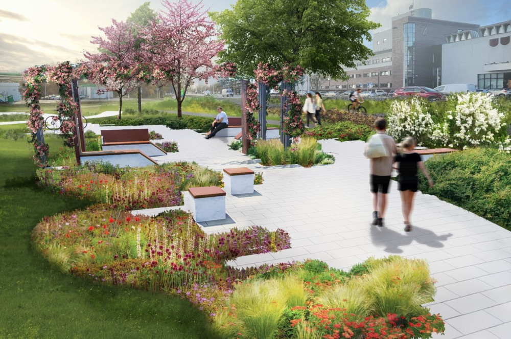 Na skwerze zaplanowano nasadzenia 18 drzew, 1250 krzewów i ponad 1000 bylin. – Część roślin pojawi się w ogrodzie deszczowym, który wesprze retencję wód opadowych i poprawi mikroklimat – wyjaśniła Kwiecień-Łukaszewska. Pergole zostaną obsadzone pnączami, które z czasem stworzą naturalne, zielone zadaszenie.