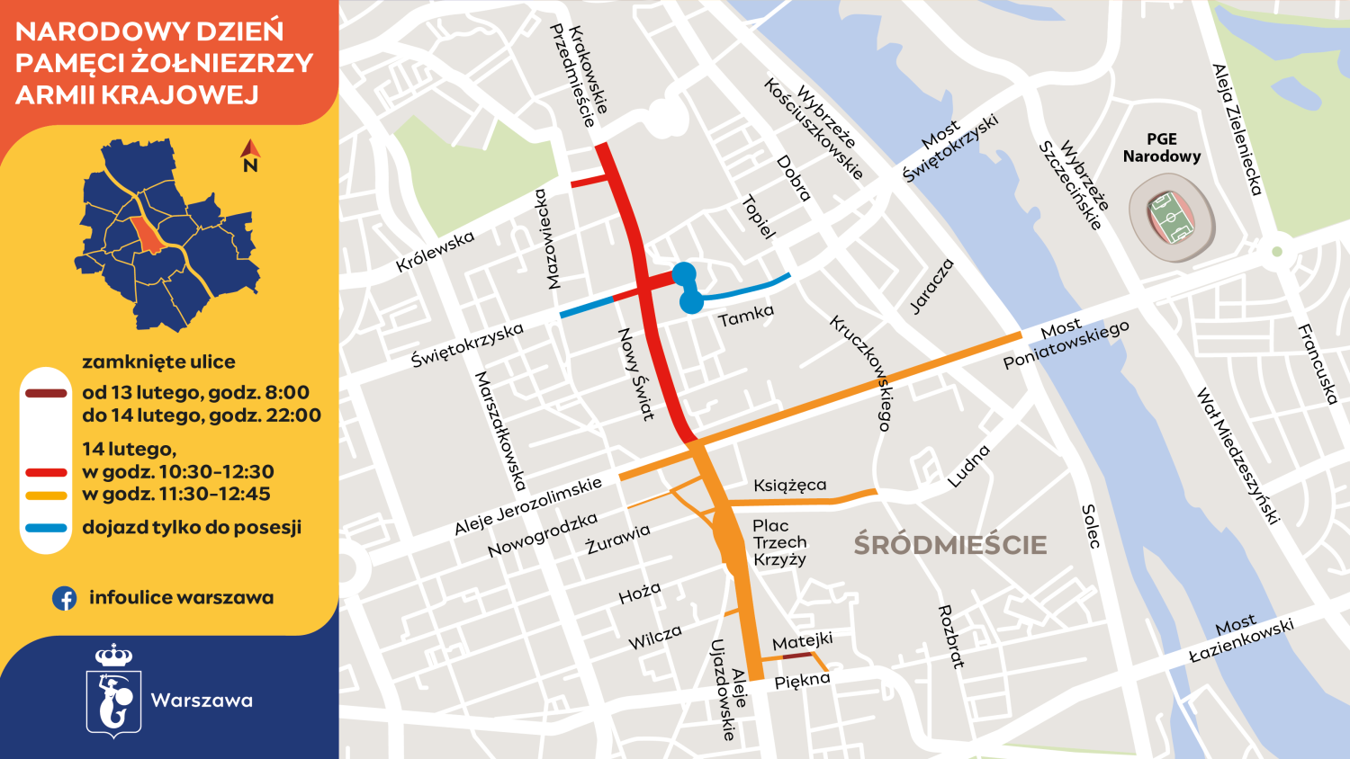 W sobotę, 14 lutego, od godziny 10:30 będą zamknięte ulice Krakowskie Przedmieście i Nowy Świat, od Tokarzewskiego-Karaszewicza do Ronda de Gaulle’a. Ulica Królewska straci połączenie z Krakowskim Przedmieściem.