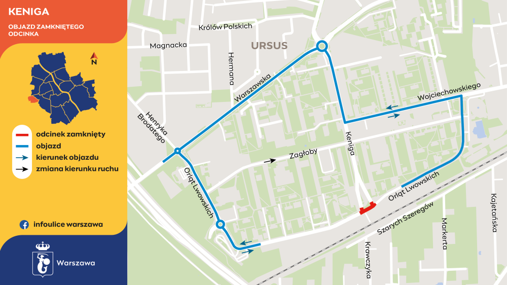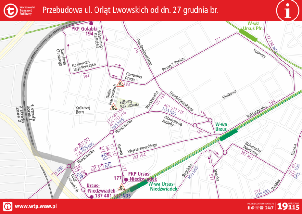 Trasa autobusu 177 została skrócona do przystanku PKP Ursus-Niedźwiadek. Linia 187 kursuje ulicą Wojciechowskiego, 194 jedzie ulicą Keniga, a 716 i N85 – ulicą Warszawską. Autobusy linii 401 i 517 do pętli Ursus-Niedźwiadek dojadą ulicami Warszawską i Orląt Lwowskich. W drugą stronę kursują Orląt Lwowskich, Zagłoby i Keniga. Linia nocna N35 będzie zaczynała i kończyła swoją trasę na pętli Ursus-Niedźwiadek. W stronę centrum pojedzie Orląt Lwowskich i Zagłoby.