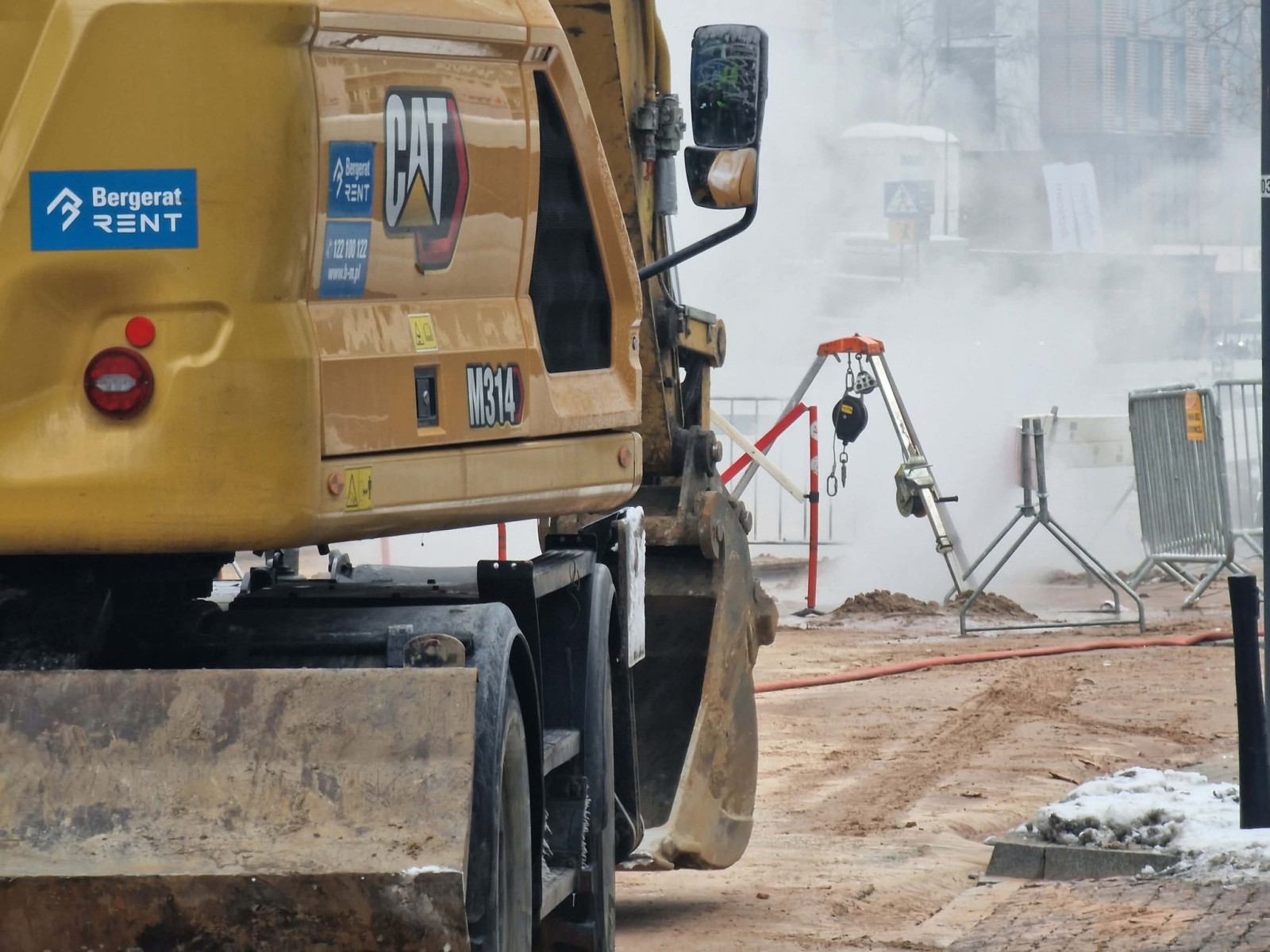 Na miejscu jest kilku pracowników pogotowia ciepłowniczego, którzy już zlokalizowali miejsce awarii i naprawiają rurociąg. Z rozkopanych studzienek wydobywa się para – to efekt pęknięcia podziemnego ciepłociągu.